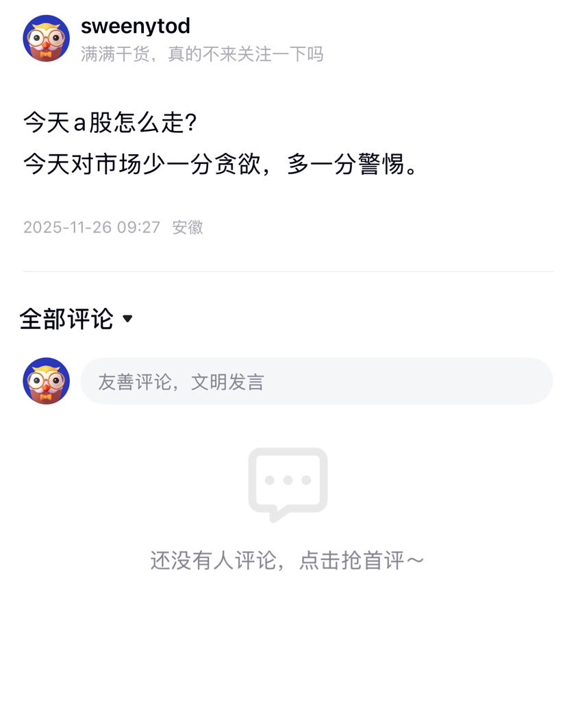 $上证指数(SH000001)$ 今天上证的走势在我预料之中,因为今天我不看涨,今天的盘面更坚定了我的估测,下面分享给大家,接下来请大家及时回避风险。也许今年你赚了很多,也许今年你没赚到,但,现在离场明年再战未尝不可。不要局限于每一天的涨跌,要有先知先觉性!很多话不方便直接说,但我希望能帮到大家。