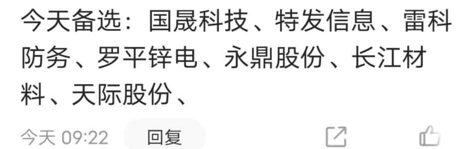 才能持续有所收获,我们要成长也要成功;集合竞价时间是衡量个股和抉择的重点方向之一,个人备选个股会在评论区盘前探讨,持有个股以及备选会结合市场各方面因素以及盘中情绪变化做出决定,今天备选:国晟科技、特发信息、雷科防务、罗平锌电、永鼎股份、长江材料、天际股份