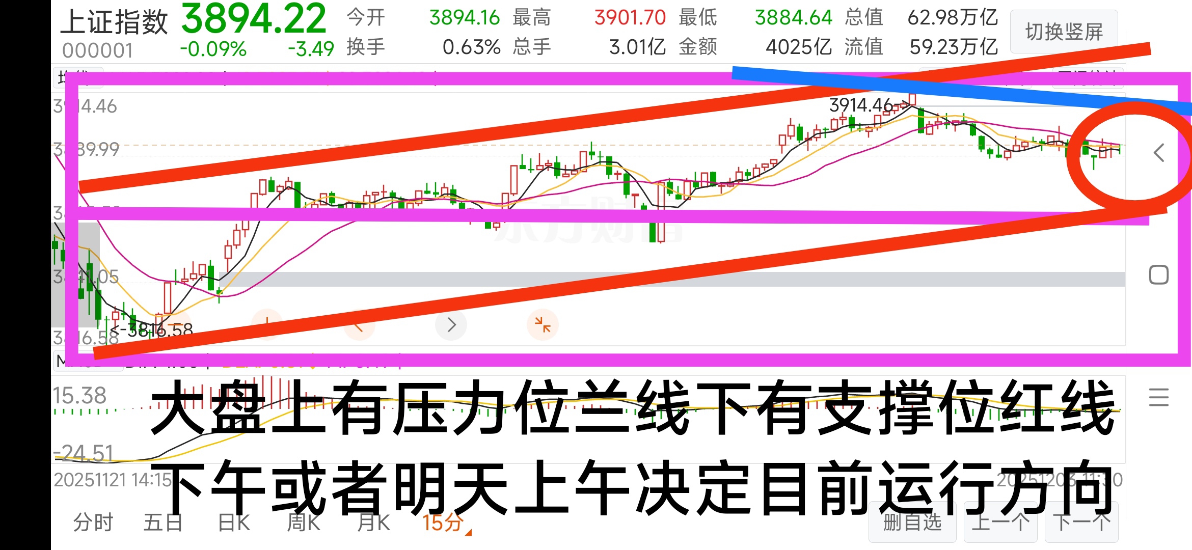 大盘上有压力位兰线,下有支撑位红线,下午或者明天上午决定目前运行方向。