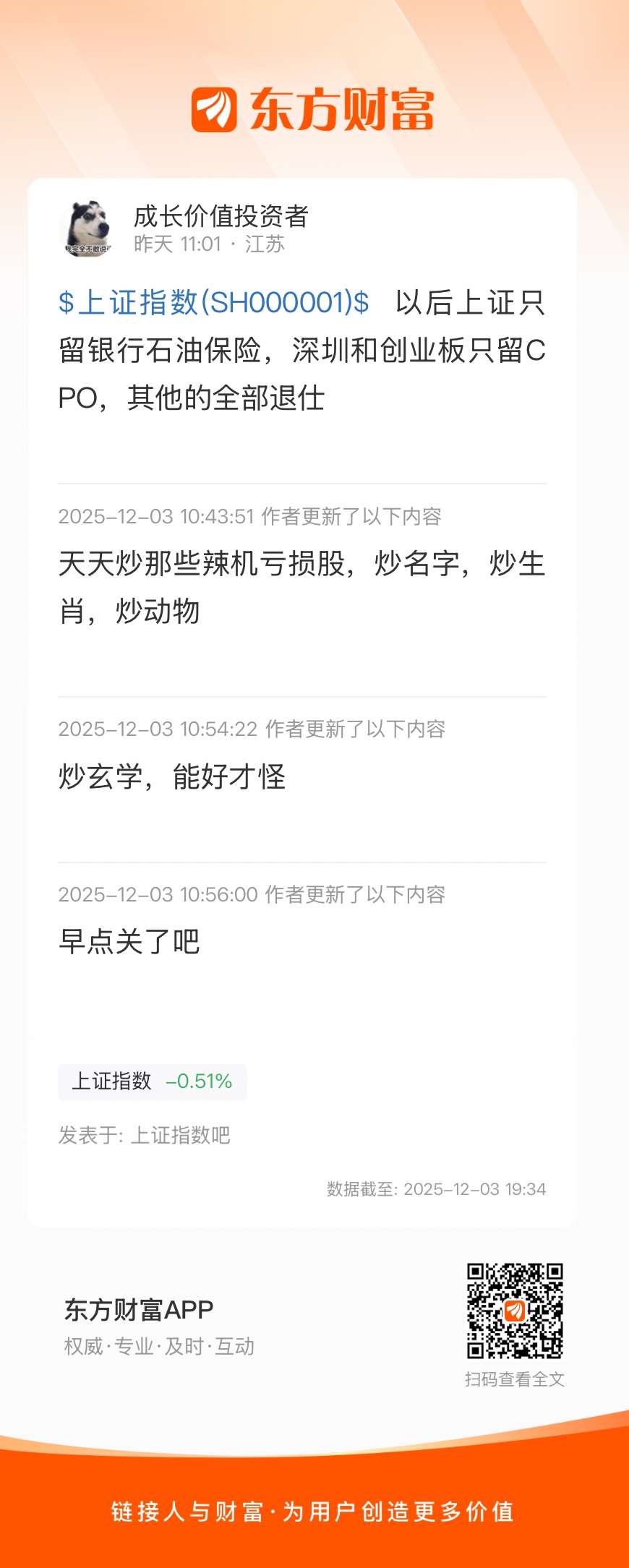 温馨提示: 1.根据《证券法》规定,禁止编造、传播虚假信息或者误导性信息,扰乱证券市场;2.用户在本社区发表的所有资料、言论等仅代表个人观点,与本网站立场无关,不对您构成任何投资建议。用户应基于自己的独立判断,自行决定证券投资并承担相应风险。《东方财富社区管理规定》