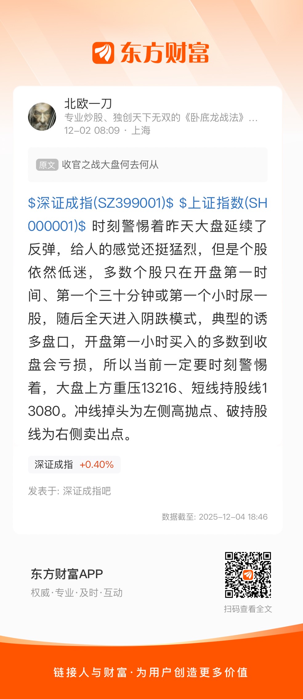 $深证成指(SZ399001)$ $上证指数(SH000001)$ 时刻警惕着昨天大盘延续了反弹,给人的感觉还挺猛烈,但是个股依然低迷,多数个股只在开盘第一时间、第一个三十分钟或第一个小时尿一股,随后全天进入阴跌模式,典型的诱多盘口,开盘第一小时买入的多数到收盘会亏损,所以当前一定要时刻警惕着,大盘上方重压13216、短线持股线13080。冲线掉头为左侧高抛点、破持股线为右侧卖出点。