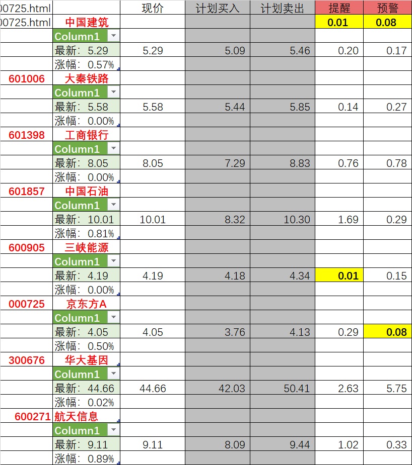 我是常年反复炒作一些自选股的,反复的低买高卖,为了及时的监测提醒,我用excel做了个表格,可以更新股票的现价,根据自己的交易策略设好买卖点位,然后通过差值的大小来设置提醒和预警,方便了好多。