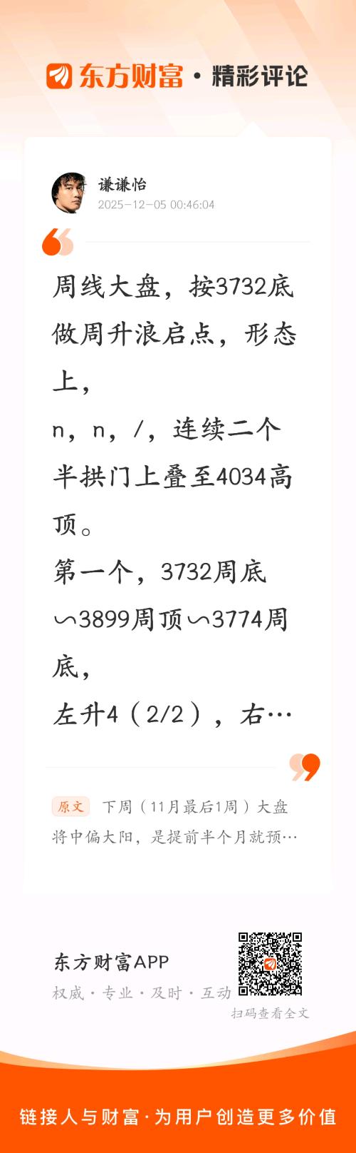 //@谦谦怡 :下周(11月最后1周)大盘将中偏大阳,是提前半个月就预计出的!上周4034点(11.17)号提前三天说周线获利的要跑路,未获利或浮亏较深的可以时间上再赌一赌!周线2440底上来28个高底(3980=26个)月线今年12月巳确定没有大于4034上的新的更高月高顶了(除11月内可以出现大于4034顶,但上周五90多点下跌表明管理层巳不愿看到4034顶再向上拓)月线震荡时间(11月21见初调底∽明...