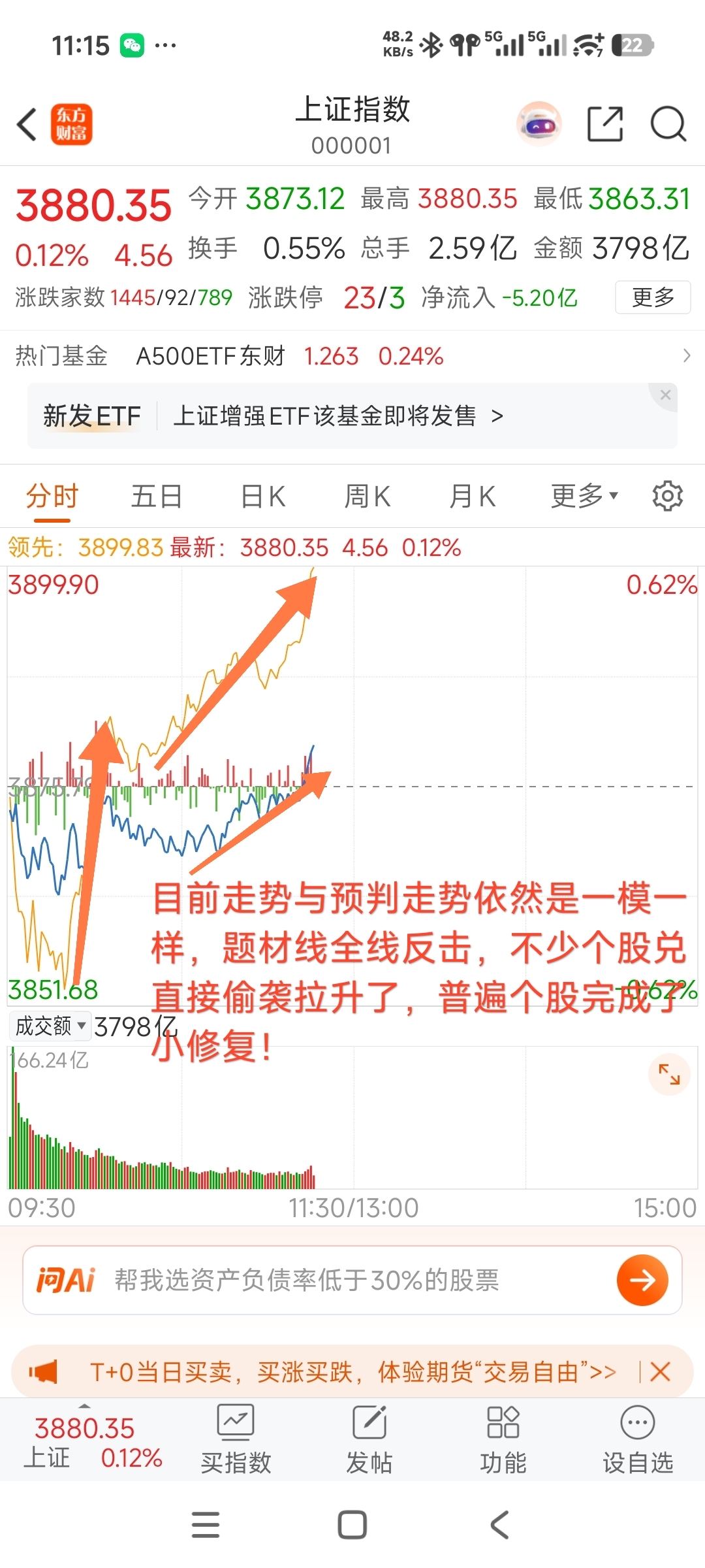 $上证指数(SH000001)$ #炒股日记# #复盘记录# #强势机会# #股市怎么看# $深证成指(SZ399001)$ 目前走势与预判走势依然是一模一样,题材线全线反击,不少个股兑直接偷袭拉升了,普遍个股完成了小修复!