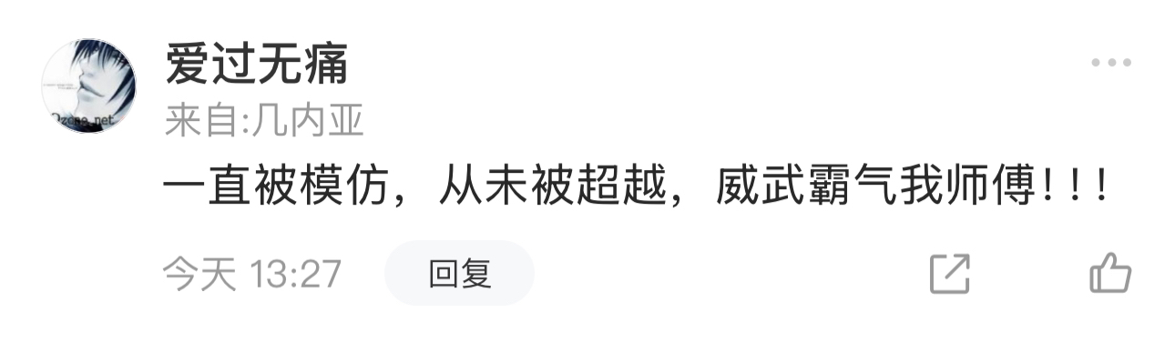 来自外国几内亚徒弟说:一直被模仿,从未被超越,威武霸气我师傅!!!