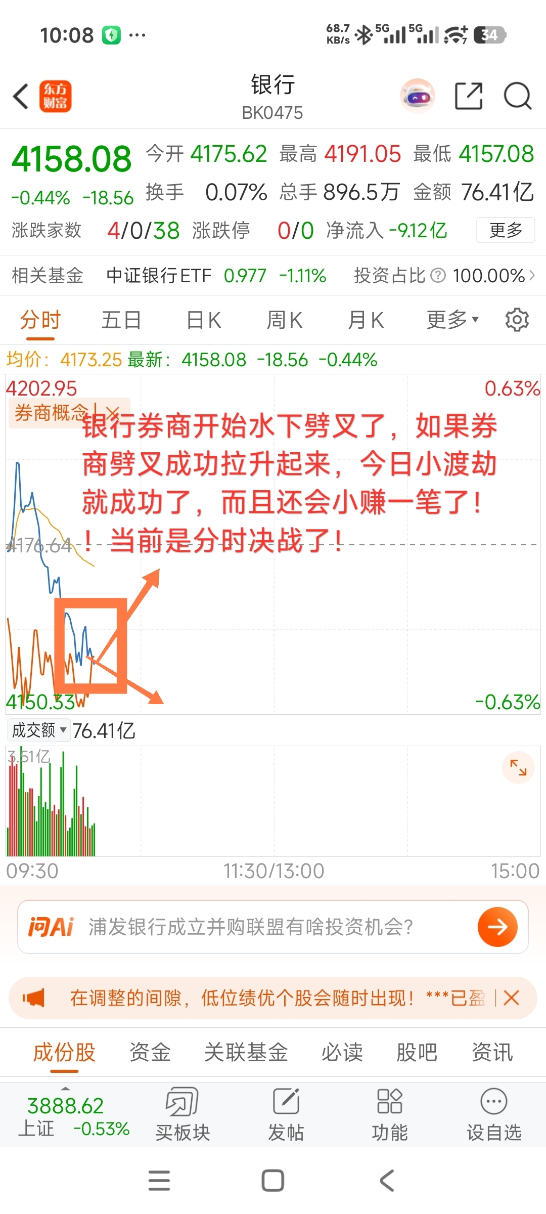 $上证指数(SH000001)$ $东方财富(SZ300059)$ $深证成指(SZ399001)$ #强势机会# #炒股日记# #复盘记录# #股市怎么看# 银行券商开始水下噼叉了,如果券商噼叉成功拉升起来,今日小渡劫就成功了,而且还会小赚一笔了!!当前是分时决战了!