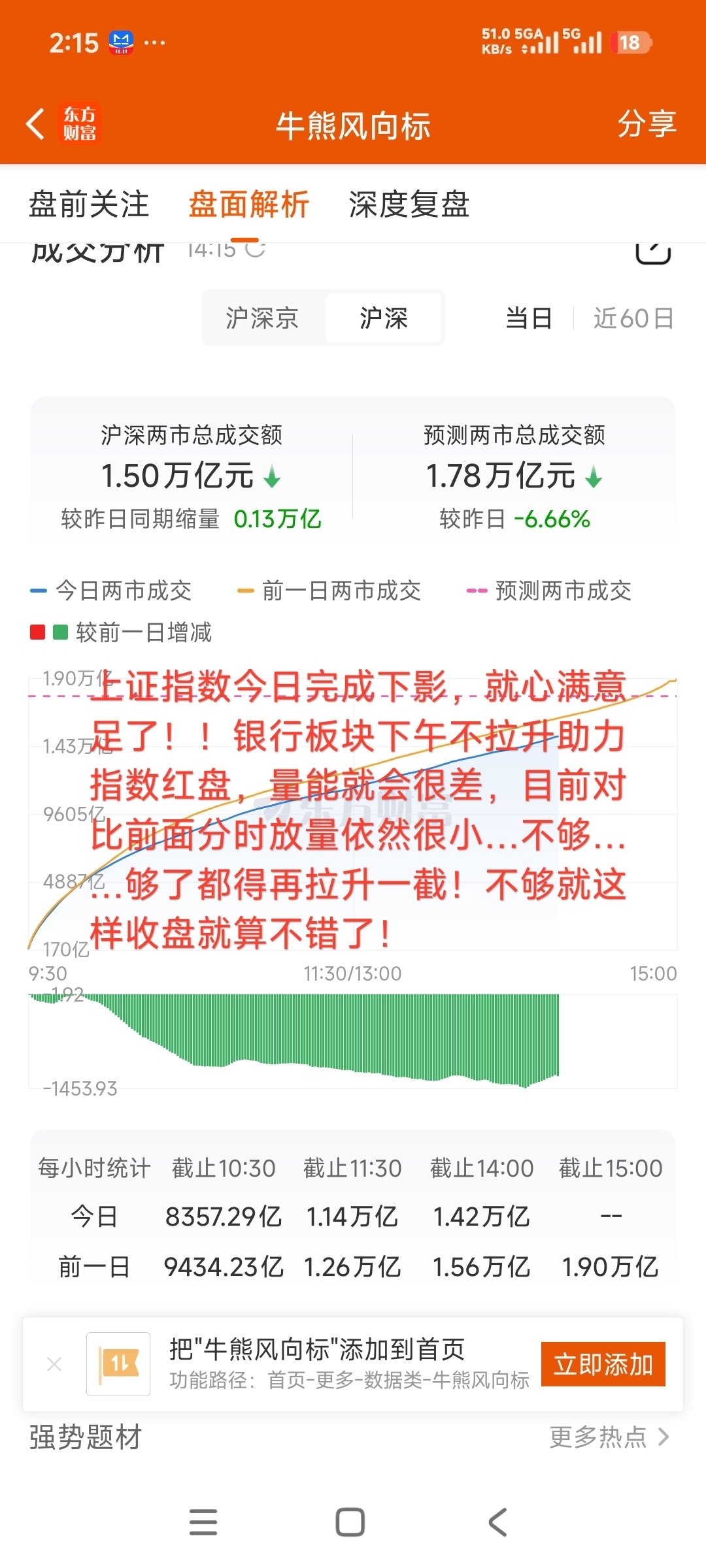 #炒股日记# #复盘记录# #强势机会# #股市怎么看# #周度策略# $东方财富(SZ300059)$ $上证指数(SH000001)$ $深证成指(SZ399001)$ 上证指数今日完成下影,就心满意足了!!银行板块下午不拉升助力指数红盘,量能就会很差,目前对比前面分时放量依然很小…不够……够了都得再拉升一截!不够就这样收盘就算不错了!