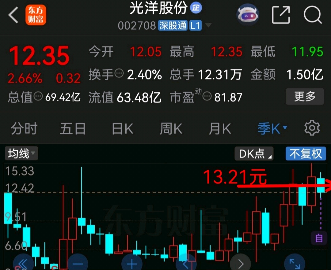 他季K图看前面三个季度K是阳阴阳两阳夹一阴突破形态,本季度回踩13.21元就是突破后回踩动作,至于13.21元惯性以下都是给你低吸机会……跌看机会…