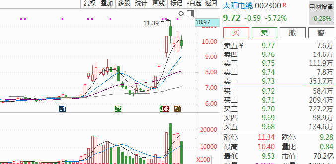 太阳电缆,板块属性是冰火两重天,光伏跟核电昨天大放异彩,但是福建板块却大幅领跌,多股跌停,太阳电缆也是福建板块个股,昨天大概就是被这个板块拖下水的,那么多跌停,而太阳电缆才跌5个来点,还带小尾巴,有惜筹的感觉,当前就是蓄势阶段,直接阳线反包就启动N型反抽了。