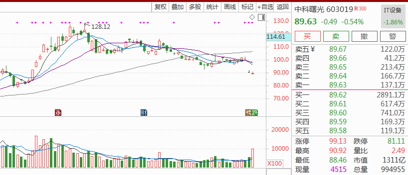 中科曙光,周三跌停,周四还没有止跌,有点火中取栗的味道,因为还处于下跌通道,周三的跌停是因为海光信息与中科曙光筹划已久的重大资产重组终止,诡异的是海光信息周三却没跌,而且周三中科曙光还被两家机够合买1个多亿抄底,主要是看补涨,收阴不格局,只看阳线反弹结构。