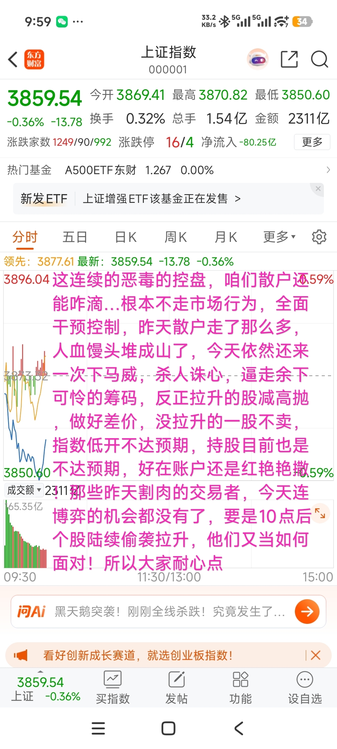 持股走势差,也是运气所致,一切都是上天最好的安排,一切焉知非福一切顺其自然,这连续的恶毒的控盘,咱们散户还能咋滴…根本不走市场行为,全面干预控制,昨天散户走了那么多,人血馒头堆成山了,今天依然还来一次下马威,杀人诛心,逼走余下可怜的筹码,反正拉升的股减高抛,做好差价,没拉升的一股不卖,指数低开不达预期,持股目前也是不达预期,好在账户还是红艳艳撒!那些昨天割肉的交易者,今天连博弈的机会都没有了,要是10点后个股陆续偷袭拉升,他们又当如何面对!所以大家耐心点