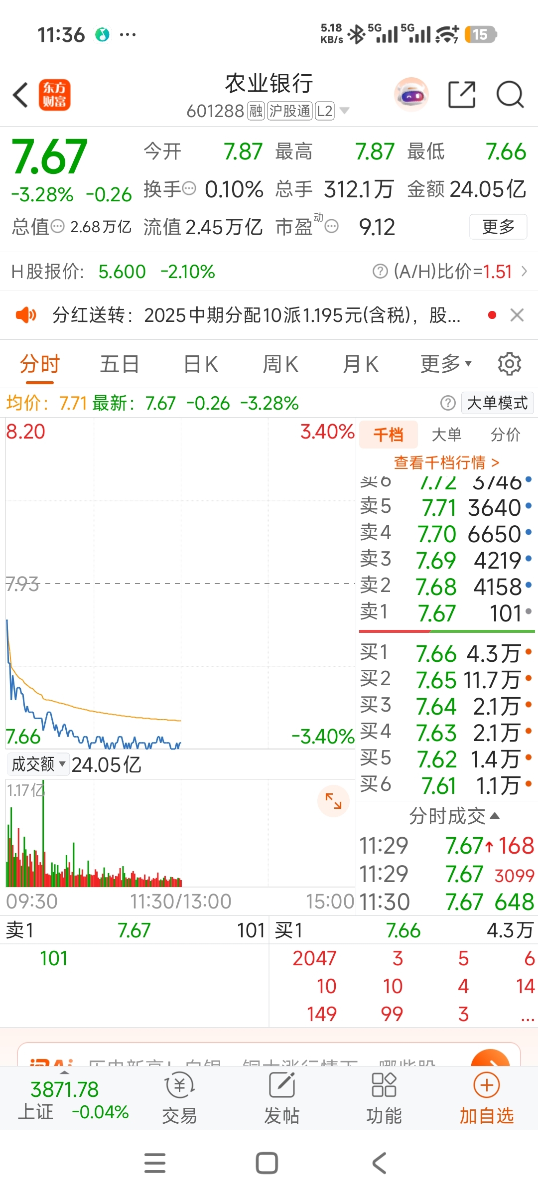 $上证指数(SH000001)$ $东方财富(SZ300059)$ $银行(BK0475)$ 农业银行昨日偷袭拉升尾盘自吸引散户追涨,今日再吸引散户进场然后直接给一棍,目前上午放量已经超过昨日全天量能了!真厉害,希望下午银行板块还是拉升一下配合市场稳定一下指数走势了!#炒股日记# #复盘记录# #强势机会# #股市怎么看# #周度策略#
