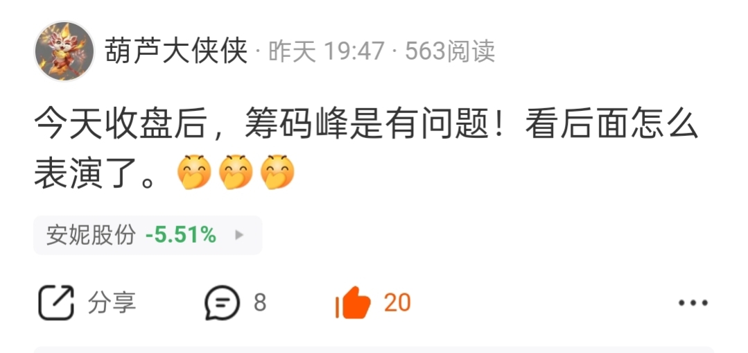 温馨提示: 1.根据《证券法》规定,禁止编造、传播虚假信息或者误导性信息,扰乱证券市场;2.用户在本社区发表的所有资料、言论等仅代表个人观点,与本网站立场无关,不对您构成任何投资建议。用户应基于自己的独立判断,自行决定证券投资并承担相应风险。《东方财富社区管理规定》