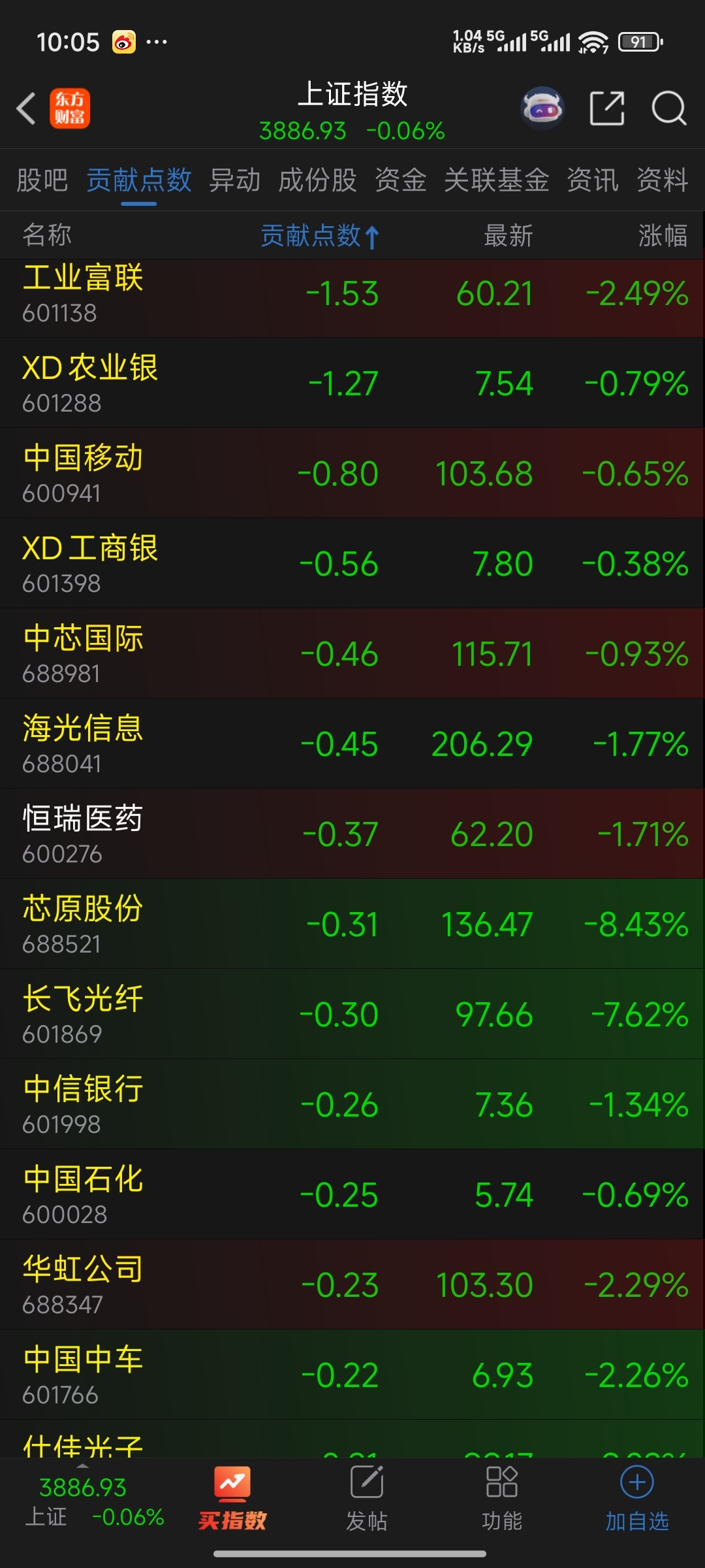 $上证指数(SH000001)$ $工业富联(SH601138)$ $农业银行(HK|01288)$ 富联、农行和移动,把大盘拖累了。