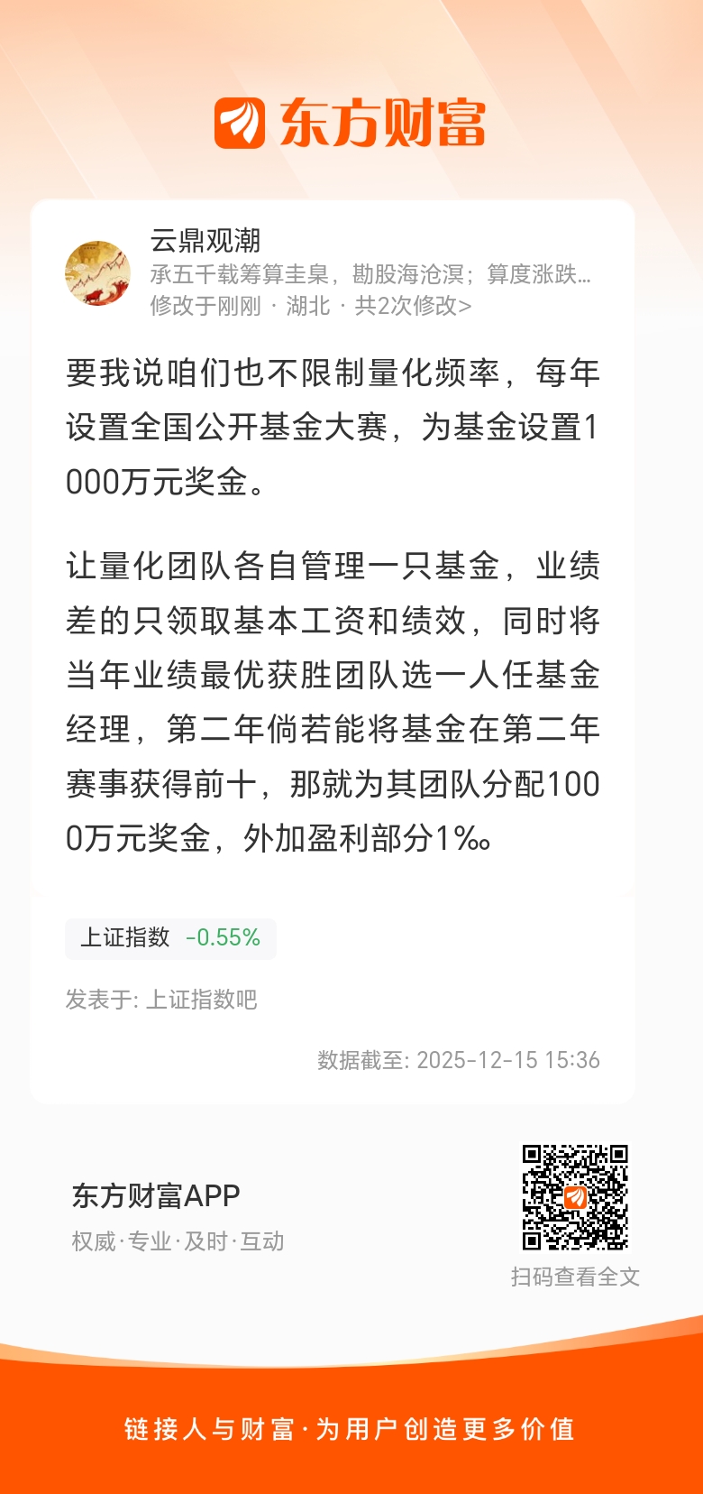 要我说咱们也不限制量化频率,每年设置全国公开基金大赛,量化、公募、私募统一排名,并且为公开基金大赛设置1000万元奖金。