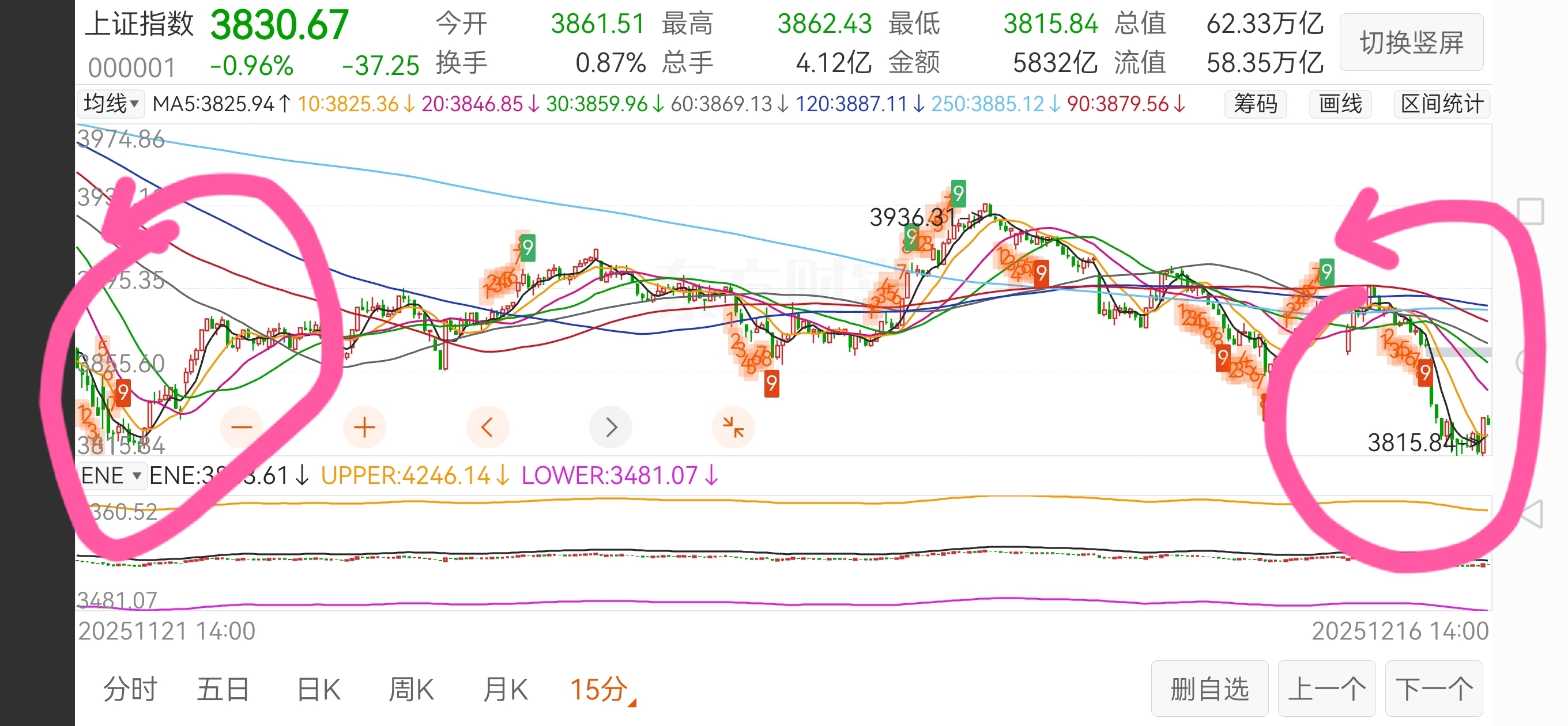 2025年12.16号15分钟线3815点和2025年11.24号15分钟线,形