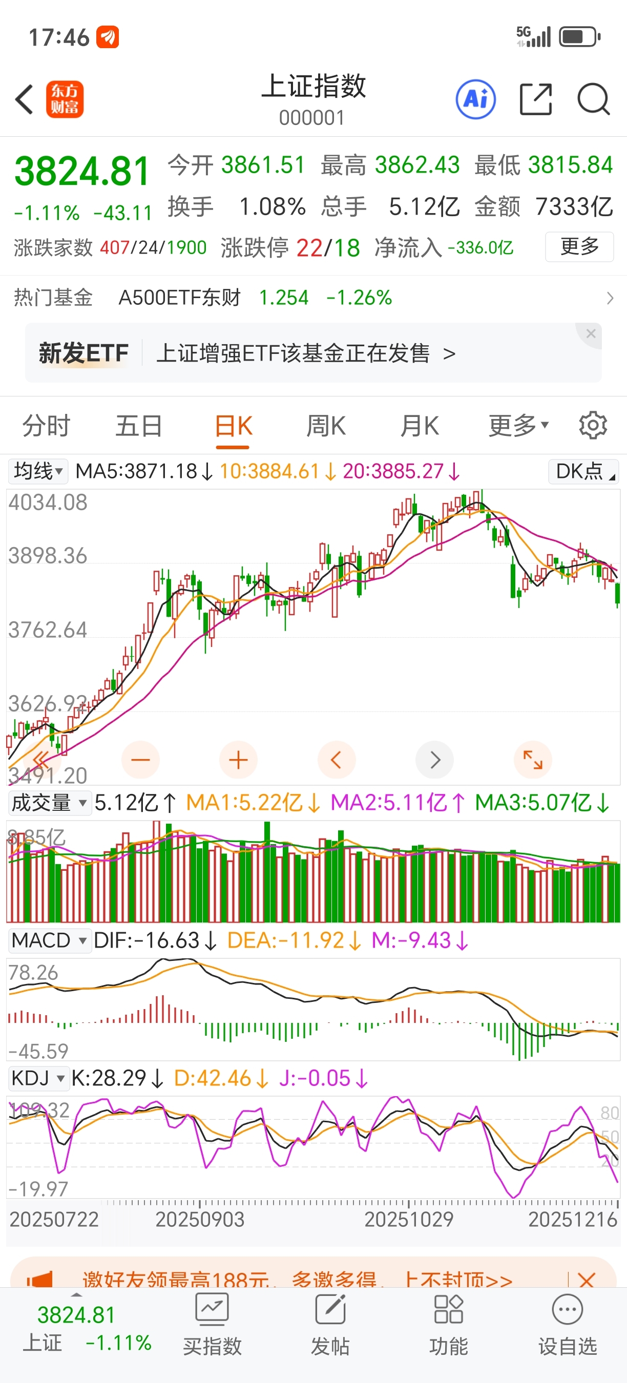 $上证指数(SH000001)$ $永辉超市(SH601933)$ $中科曙光(SH603019)$ 明天开始大盘会止跌回升,如果从明天开始计算大盘七个交日易还没有占上3950点那么大家一定要注意1月份左右大盘绝对会有一次连续大跌三天的一个走势!我可以百分之百确定肯定一定大跌第四天早盘开盘就是全仓抄底博反弹的时候