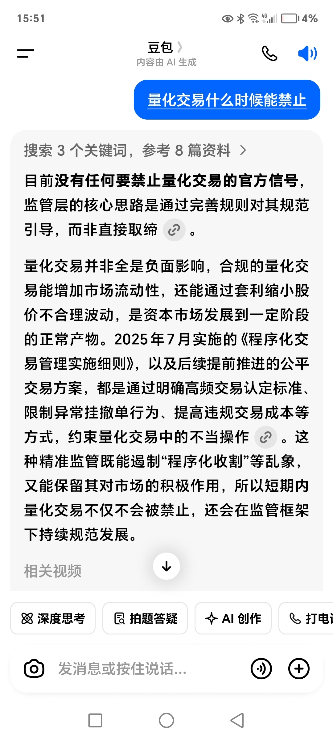 $上证指数(SH000001)$ 今天问了下豆包关于量化是否被禁止的回答,豆包是这么说的