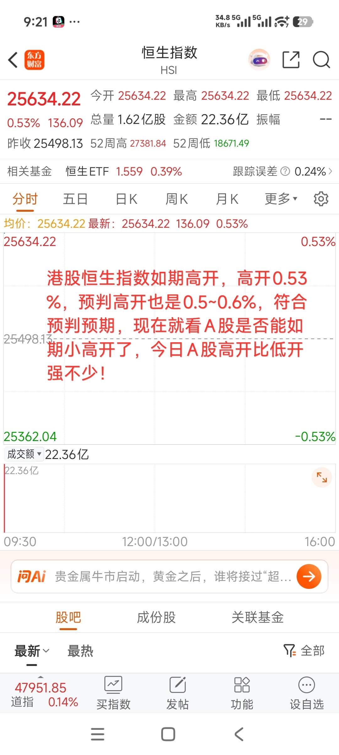 港股恒生指数如期高开,高开0.53%,预判高开也是0.5~0.6%,符合预判预期,现在就看A股是否能如期小高开了,今日A股高开比低开强不少!