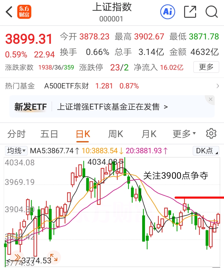 上证指数日线上午继续走三连阳完成修复3900点,下午继续留意3900点能不能站上