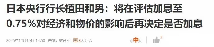 另外这里还要说一个大消息,中午大家也都看到了,日本央行宣布加息了,将基准利率从0.5%提高到了0.75%,创30年以来的新高。这也是自今年1月以后,日本央行的再次加息。如今加息已经落地,但同时也传来了新的消息,日本央行方面表示,在利率达到0.75%之后,不排除后续会根据经济和价格改善情况选择进一步加息,他们认为距离中性利率区间的较低端还有一段距离。