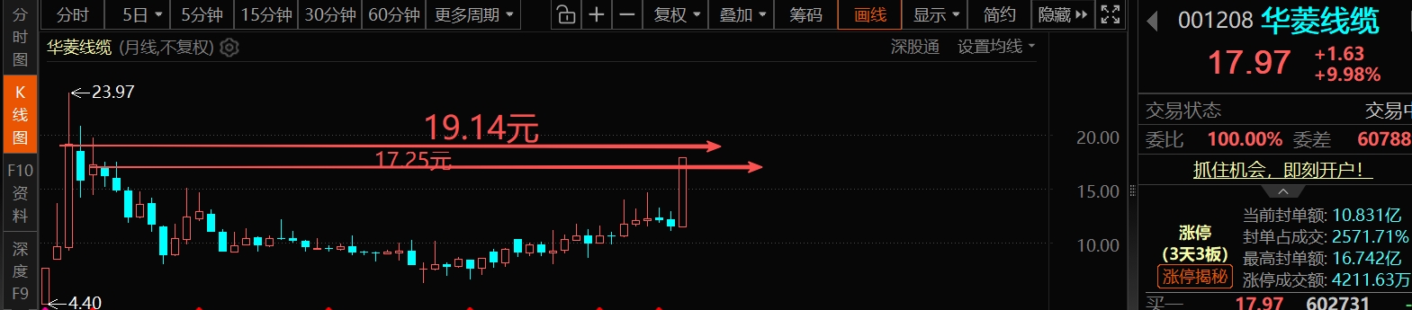 今天又是一字板,准备冲击月最高平台19.14元(应该明天继续大幅高开高走就可以看到),今天涨停板17.97元,