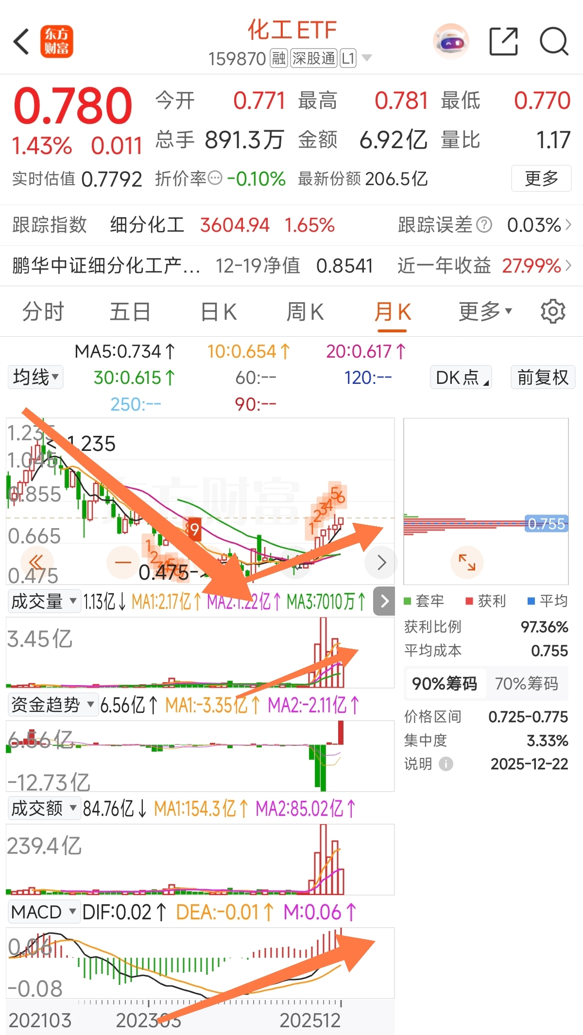 你翻开化工板块的股票,从月线图走势看看,是不是大部分都 是大锅底的形态呢!再看看卧龙看好的$化工ETF(SZ159870)$ ,上周五上涨近两个点,周一上涨又是一个多点。这趋势标无用功的三线上方,好的没得说了。卧龙又定投了一批!很多时候,机会在大家眼前,很多人犹豫不决,视而不见。可是等你下定决心时,再想低价买入已不可能了。这个趋势走的也很好,也没有加速,还有些预期差,这可是化工板块中规模最大的一只呢!要选就选最强的龙头。