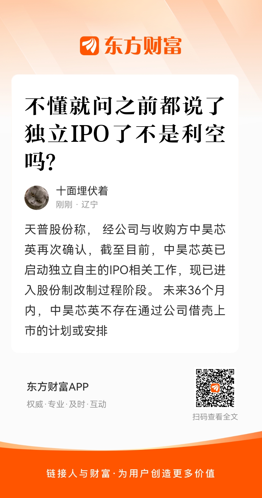 天普股份称, 经公司与收购方中昊芯英再次确认,截至目前,中昊芯英已启动独立自主的IPO相关工作,现已进入股份制改制过程阶段。 未来36个月内,中昊芯英不存在通过公司借壳上市的计划或安排