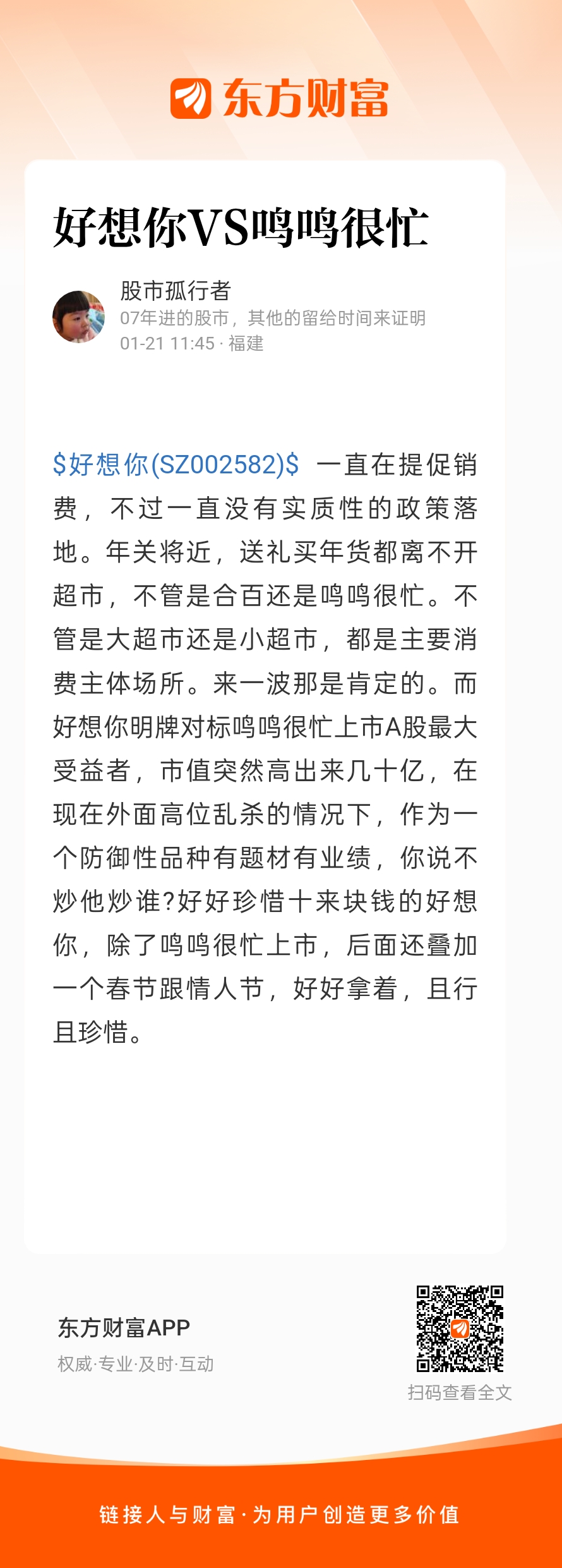 $好想你(SZ002582)$ 一直在提促销费,不过一直没有实质性的政策落地。年关将近,送礼买年货都离不开超市,不管是合百还是鸣鸣很忙。不管是大超市还是小超市,都是主要消费主体场所。来一波那是肯定的。而好想你明牌对标鸣鸣很忙上市A股最大受益者,市值突然高出来几十亿,在现在外面高位乱杀的情况下,作为一个防御性品种有题材有业绩,你说不炒他炒谁?好好珍惜十来块钱的好想你,除了鸣鸣很忙上市,后面还叠加一个春节跟情人节,好好拿着,且行且珍惜。