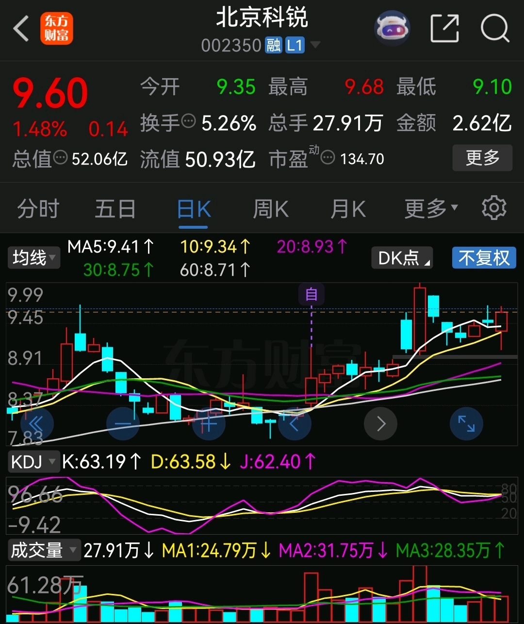 北京科锐,明天冲击9.99元,如刷新,日线KDJ就金叉,周四调整一下,调整目的就