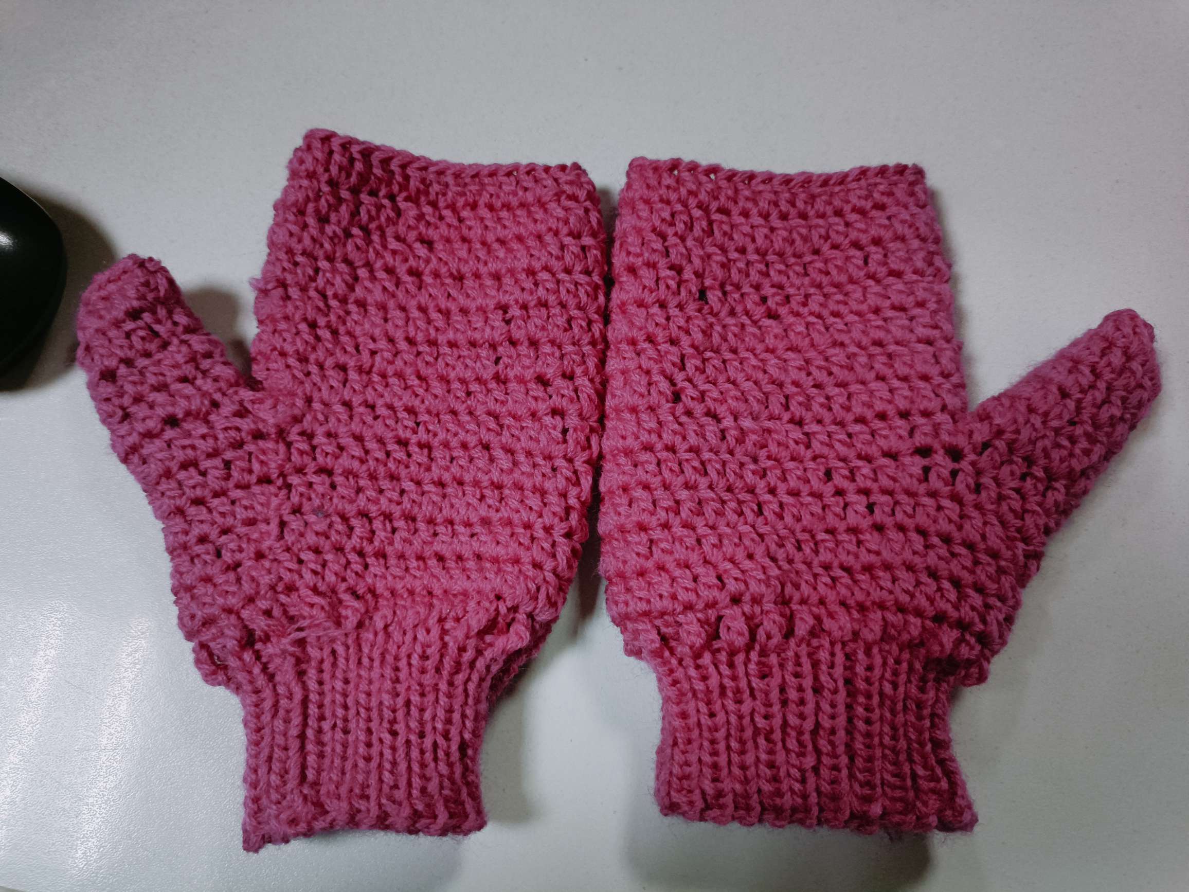 刚钩好的手套,上部是钩针钩的,螺纹处是棒针织的