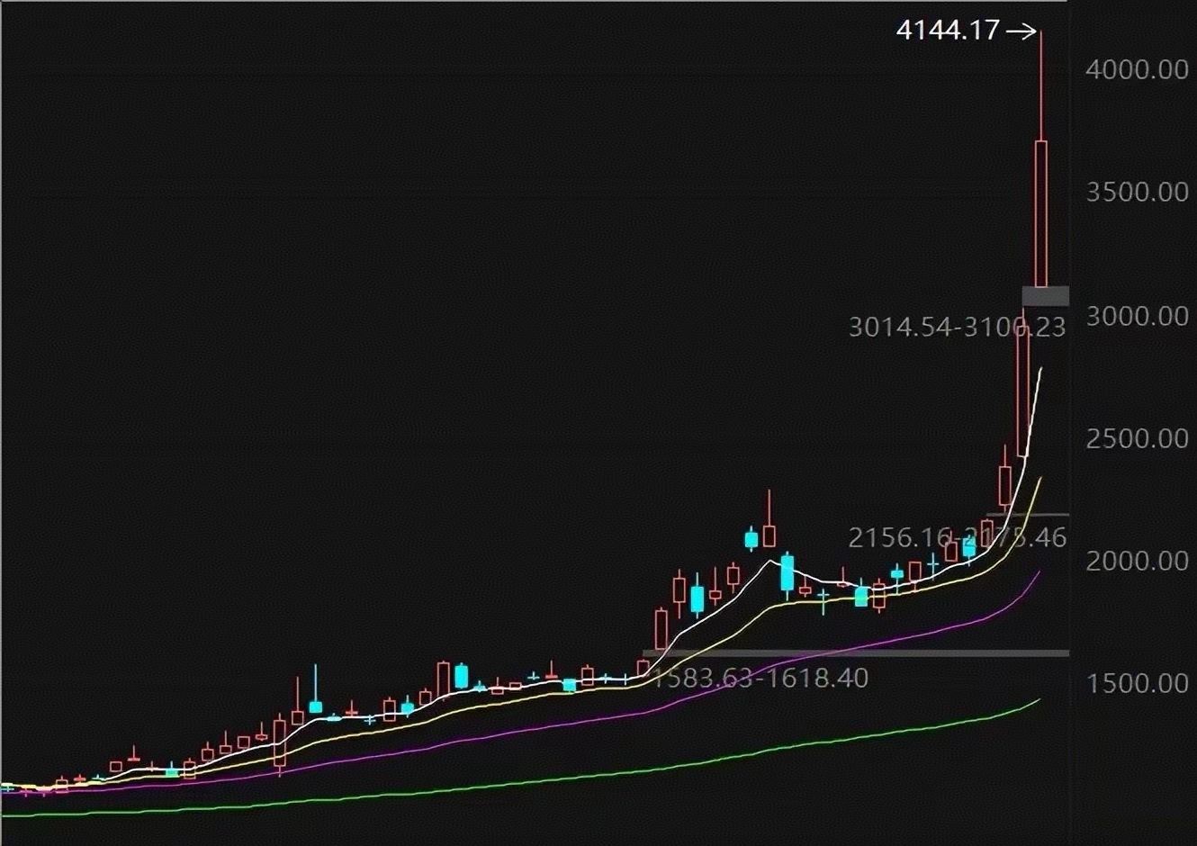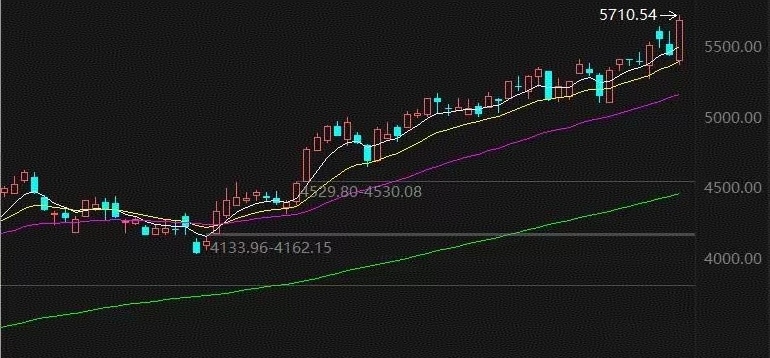 看一下其他板块的走势情况。昨日收盘之后,玫瑰已经提示过大家注意贵金属板块的短期风险,因为是很明显的加速拉升态势,这意味着短期即将见顶。而且那根假阴线离下方5日均线偏离的太远,今天迎来大幅下跌都是在预期之内的,符合我们的预期,因为短期上涨的基础已经非常不牢固了。目前还没有跌破5日均线,日线短期还没有走坏。但是玫瑰跟大家说过这一波跌破60分钟级别的5均线就应该考虑短期离场了,今日基本上没给这样的机会,直接大幅低开了,那么下个交易日就要关注5日进攻线了,跌破了需要考虑进一步控制好仓位。周线级别其实趋势上看也是很清晰的,如下图所示,指数明显已经离白色进攻线非常远了,这种态势下,理智的投资者不会无脑杀进去的。