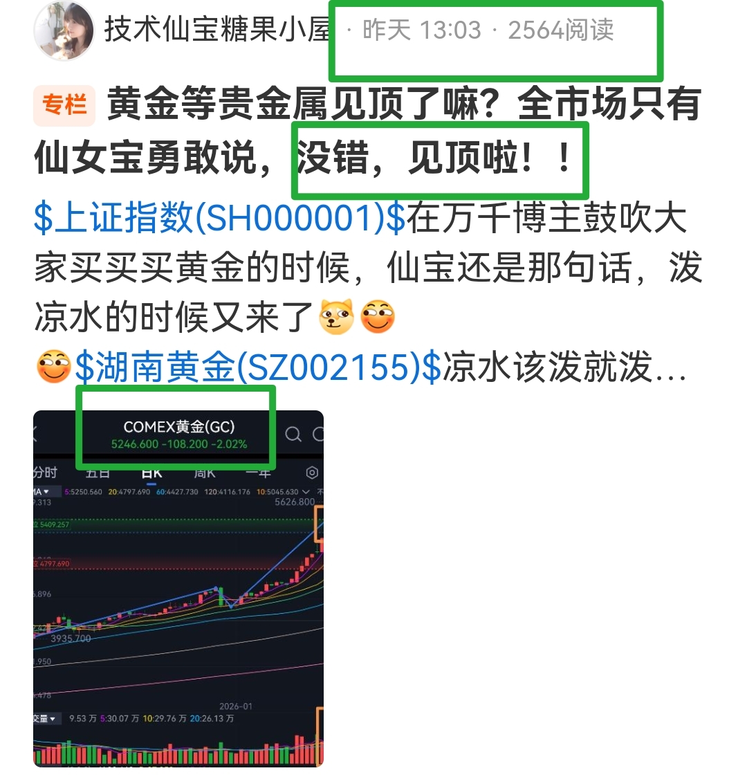 但从上周开始,黄金利好消息开始满天飞,再加上花旗和美国某公司高举黄金未来突破8500美元的“神话论”,还有万千博主,包括但不限于X音X手X条,一夜之间有多少人推崇黄金的价值和目前的所谓“白菜价”,这才把黄金的热度推向了高潮,资本家们背后笑的合不拢嘴,正愁无法出货呢,也正开展了这个时机,资本家的镰刀终于挥向了这批饱满多汁,成熟稳重的韭菜们,开始疯狂的派发出场