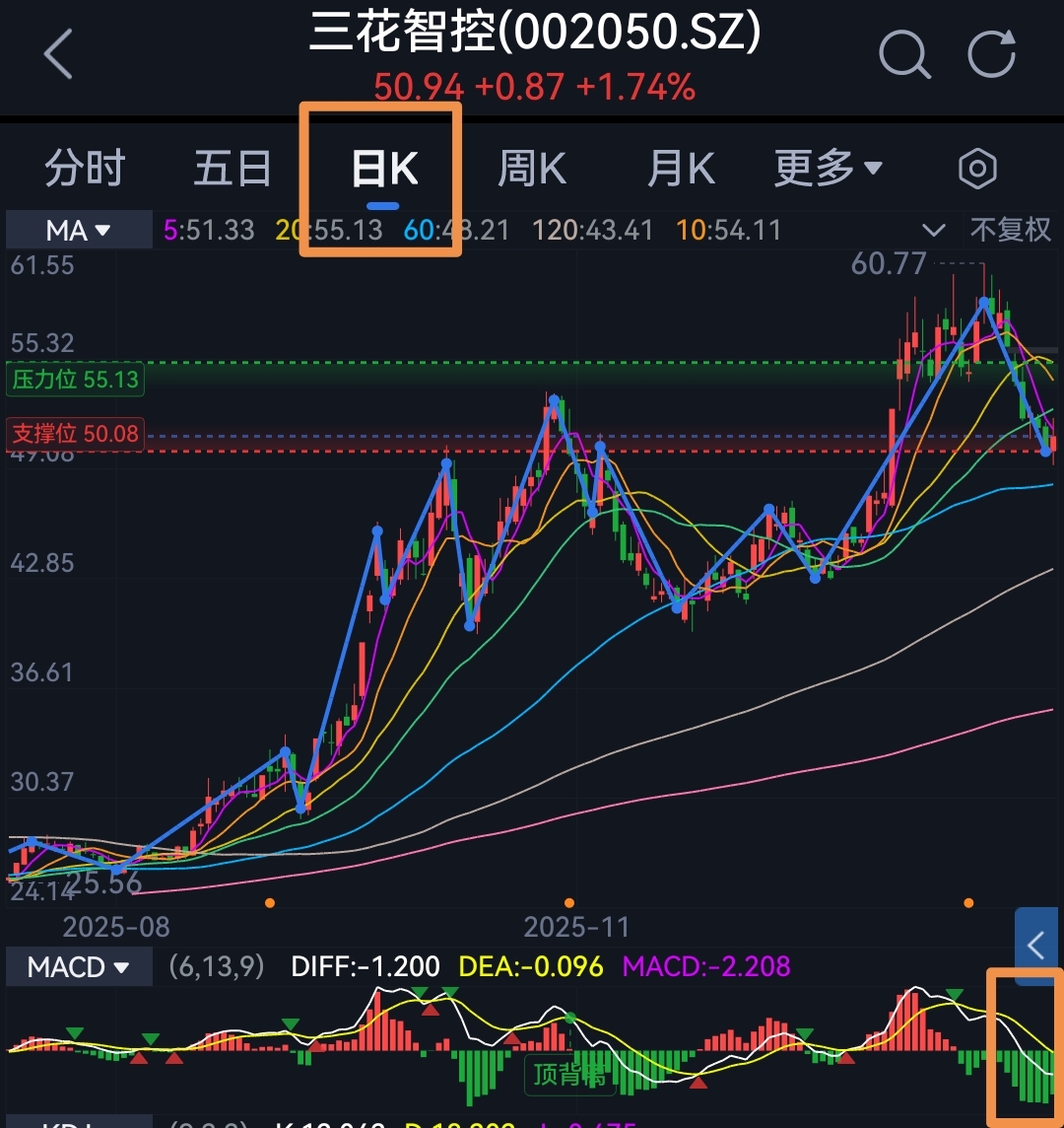 $三花智控(SZ002050)$ 有粉丝宝宝们提到这支票,那这个票票其实也是比较经典的共振下跌模型【注意只是参考,不是真暴跌哈,因为它多少还有一点点令人满意的地方】