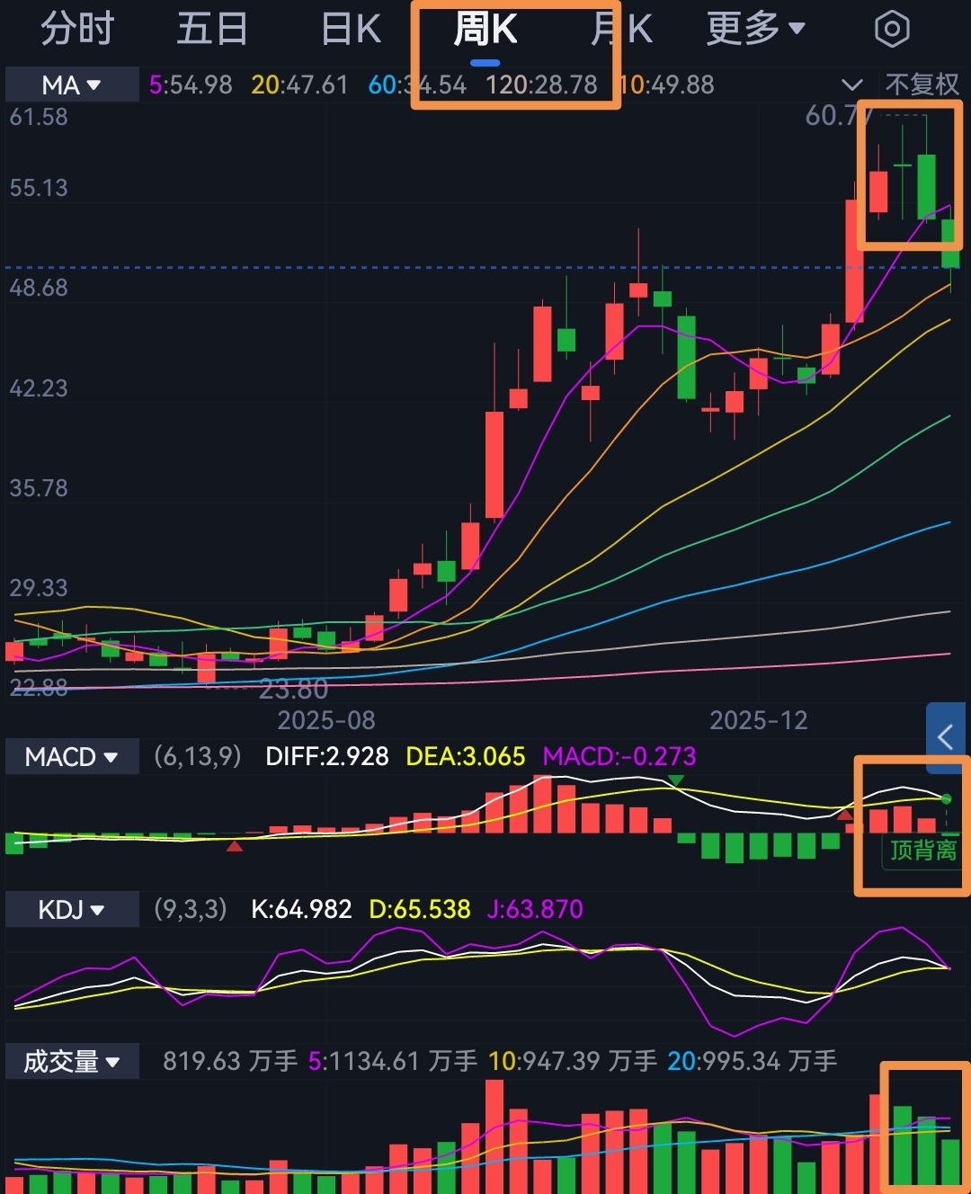 周线,缩量~顶分型和顶背离,两个顶是不是也很危险了?