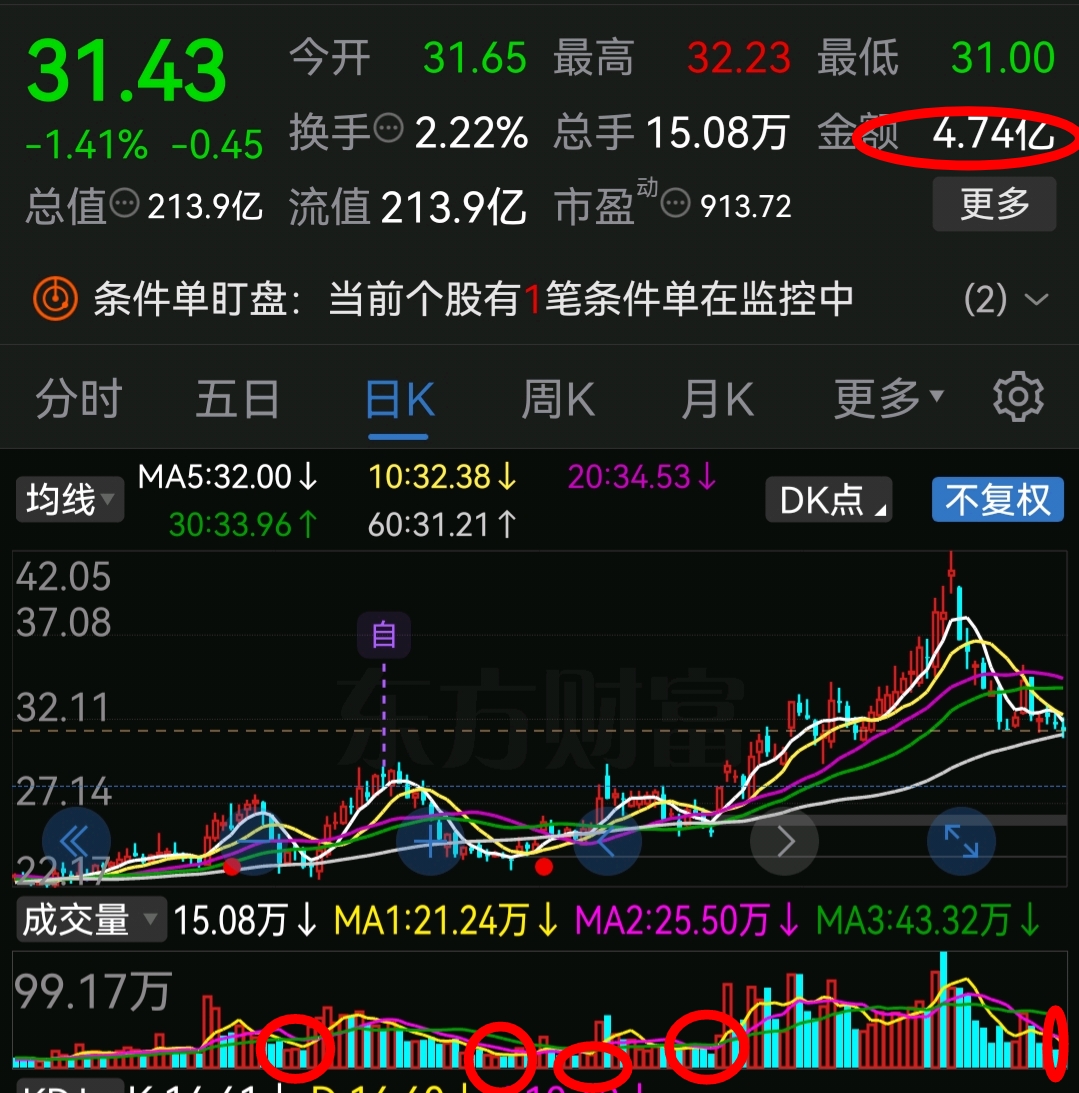 目前从天量38—27亿已经缩到目前4亿左右,后市跨月初要么继续缩量到3亿左右破31元,要么就目前4亿左右成交量成目前地量水平……地量阶段地价?看点,