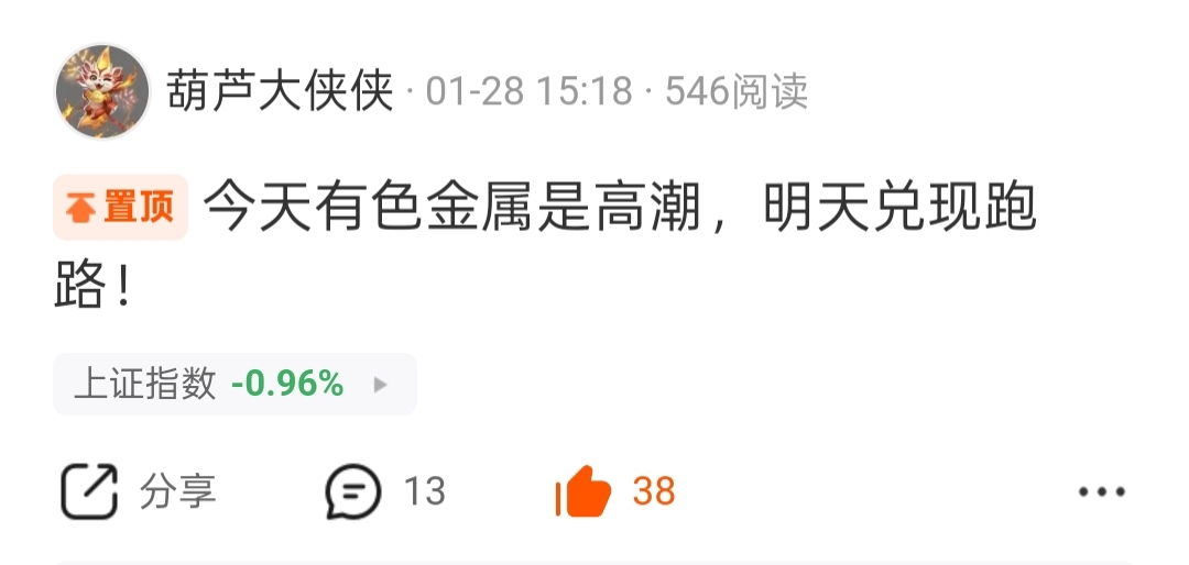 2026.1.28号收盘后提示,1.29号最后一天高潮,1.30号全线被闷!葫芦侠目前是大A顶级的山顶吹哨人! $四川黄金(SZ001337)$ $白银有色(SH601212)$ $豫光金铅(SH600531)$