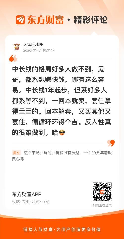 中长线的格局好多人做不到,鬼哥,都系想赚快钱,哪有这么容易。中长线1年起步,但系好多人都系等不到,一回本就卖,套住拿得亖亖的。回本解套,又买其他又套住,循循环环得个吉。反人性真的很难做到。哈