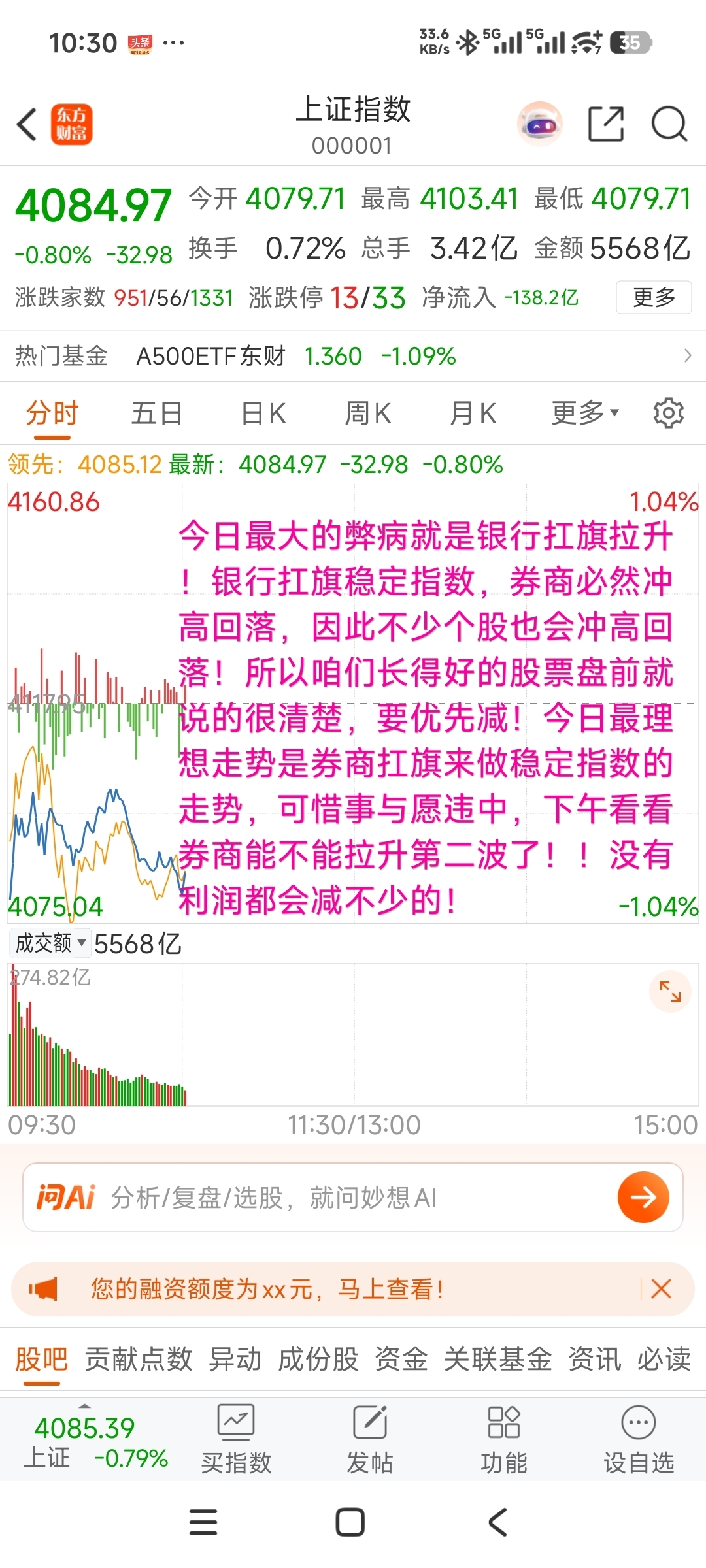 果然上午券商扛不住了!看下午是否还有一次反击了!没有就集体冲高回落,上午没减的银子化成水,上午追涨的直接难受了