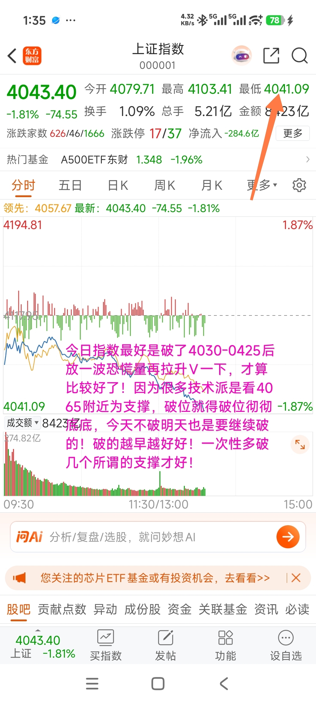 今日指数最好是破了4030-0425后放一波恐慌量再拉升V一下,才算比较好了!因为很多技术派是看4065附近为支撑,破位就得破位彻彻底底,今天不破明天也是要继续破的!破的越早越好好!一次性多破几个所谓的支撑才好!