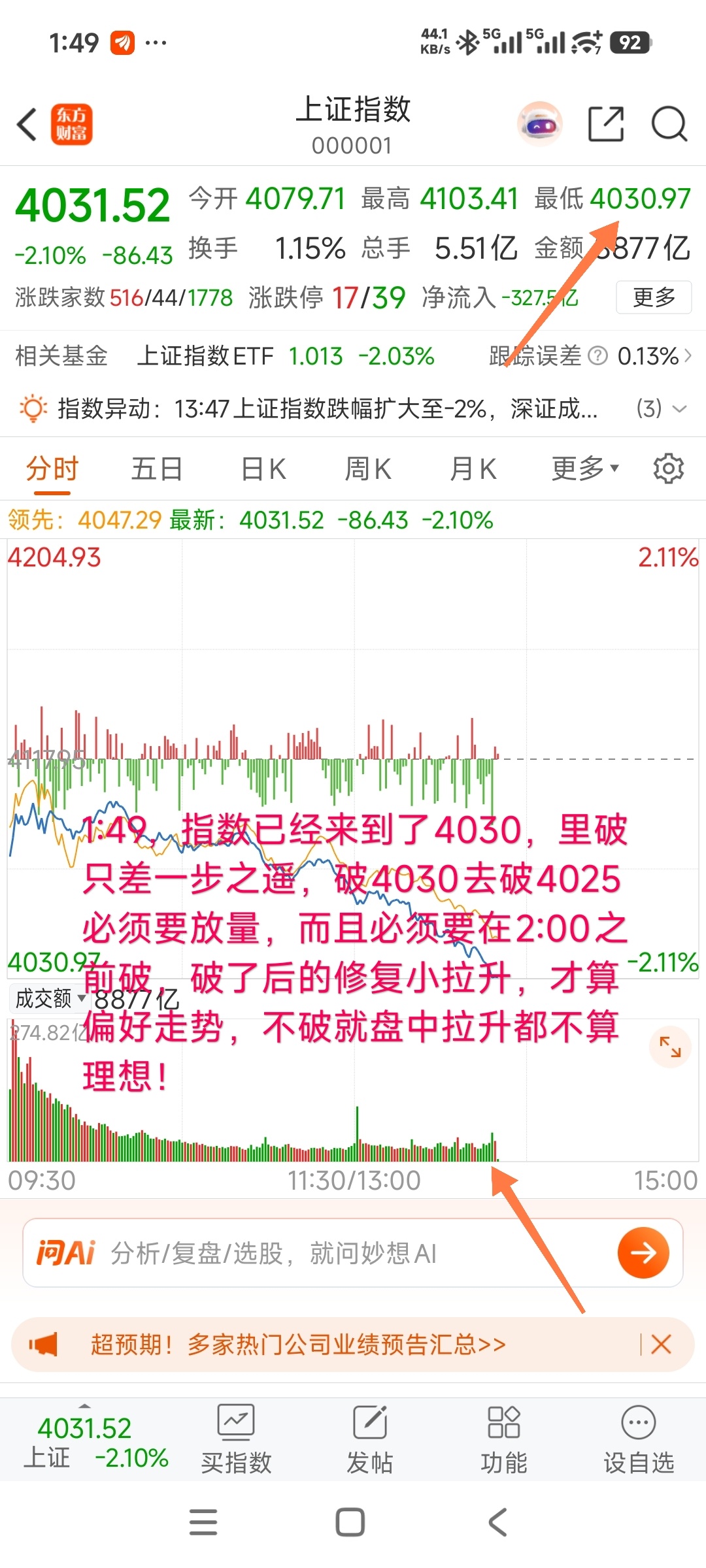 1:49,指数已经来到了4030,里破只差一步之遥,破4030去破4025必须要放量,而且必须要在2:00之前破,破了后的修复小拉升,才算偏好走势,不破就盘中拉升都不算理想!