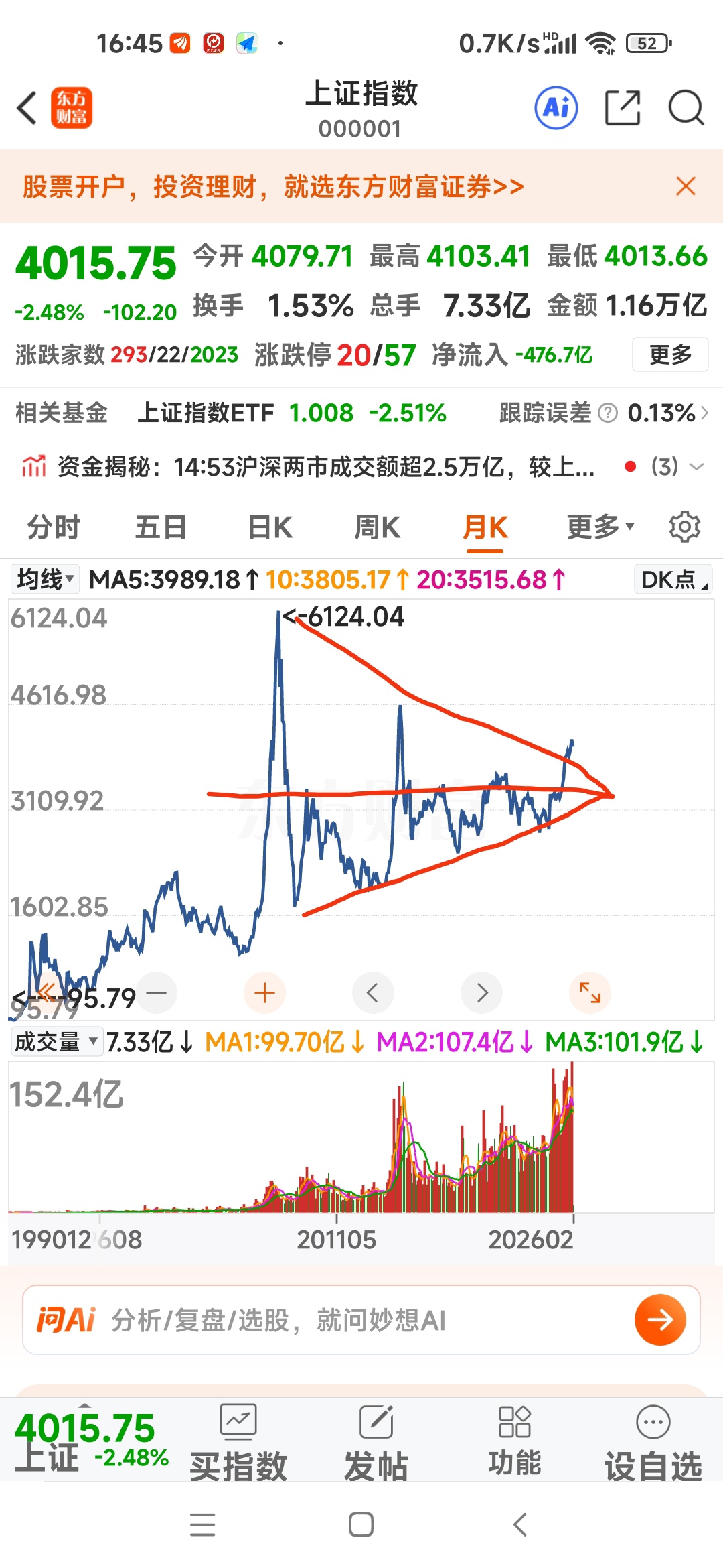 $上证指数(SH000001)$ 楔形与轴线相交点大致位于3600~3700点。