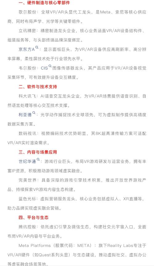 亚洲虚拟现实XR产业展览会(AWE Asia 2026)2月2日~4日将在新加坡举办!$数码视讯(SZ300079)$ 虚拟与现实概念核心公司一、硬件制造与核心零部件歌尔股份:全球VR/AR头显代工龙头,是Meta、索尼等核心供应商,同时布局声学、光学等关键零组件。立讯精密:精密制造龙头企业,核心业务涵盖VR/AR设备结构件、组装服务等,与头部终端品牌深度绑定。京东方A:显示面板巨头,为VR/AR设备供应高刷新率、高分辨率屏幕,柔性屏技术处于行业领先水平。韦尔股份:CIS图像传感器龙头,其产品应用于VR/AR设备视觉采集环节,可有效提升设备交互精度。二、软件与技术支持科大讯飞:AI语音交互龙头企业,为VR/AR场景提供语音识别、自然语言处理等核心交互技术支撑。利亚德:光学动作捕捉技术全球领先,可为虚拟制作提供高精度数据采集方案。数码视讯:视频编码技术优势明显,其8K超高清传输方案可适配VR/AR实时渲染需求。三、内容与场景应用世纪华通:游戏行业巨头,布局VR游戏研发与运营业务,拥有丰富IP资源,积极推动游戏领域虚实融合。完美世界:具备深厚的游戏引擎技术积累,推出开放世界游戏产品,持续探索VR游戏内容生态构建。蓝色光标:虚拟营销服务龙头,核心业务包括虚拟人、XR直播等,助力品牌实现虚实融合营销。四、平台与生态腾讯控股:依托虚幻引擎及微信生态,构建社交元宇宙入口,全面布局VR/AR内容与平台业务。Meta Platforms(股票代码:META):旗下Reality Labs专注于VR/AR硬件(如Quest系列头显)与生态建设,推动虚拟社交、虚拟办公等虚实融合场景落地。