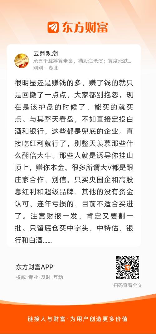 现在是该护盘的时候了,能买的就买点。与其整天看盘,不如直接定投白酒和银行,这些都是兜底的企业。直接吃红利就行了,别整天羡慕那些什么翻倍大牛。