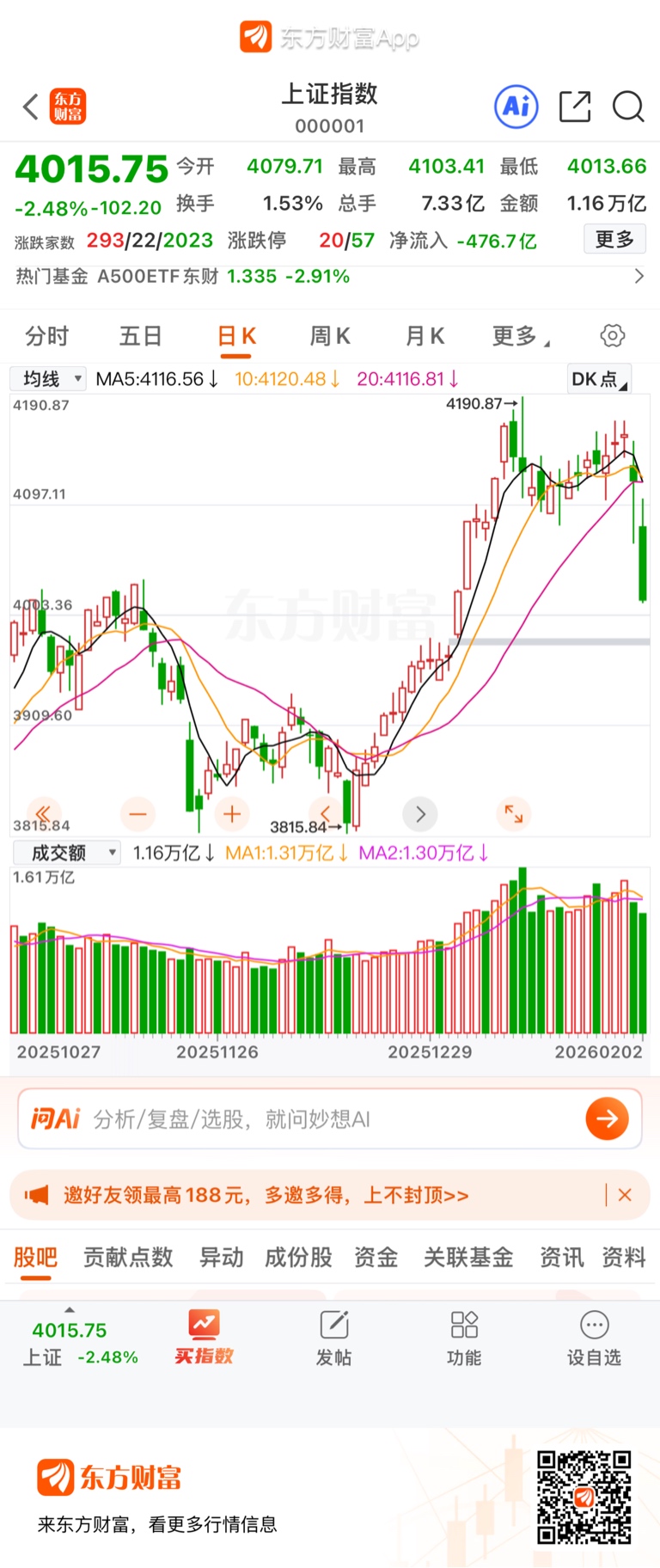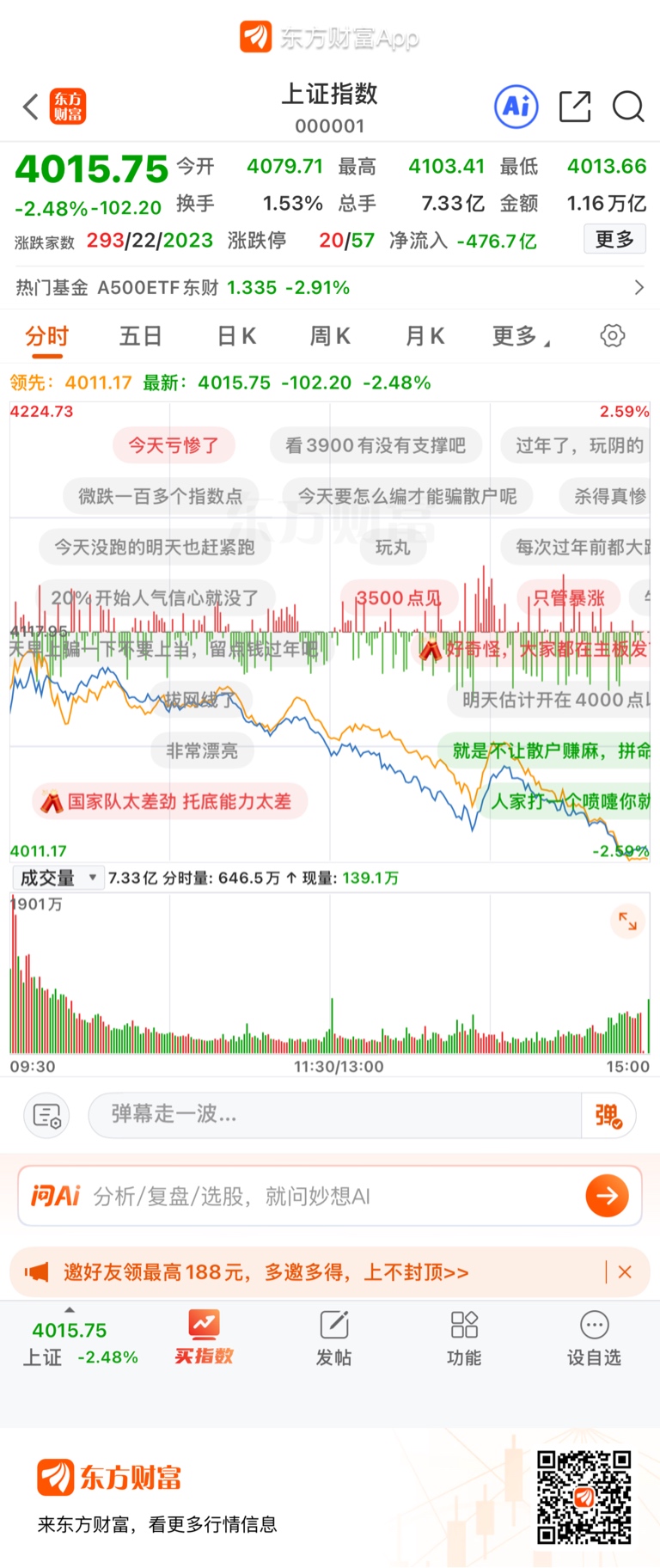 #社区牛人计划# $上证指数(SH000001)$ 百点长阴,4000点保卫战打响。#收盘点评#