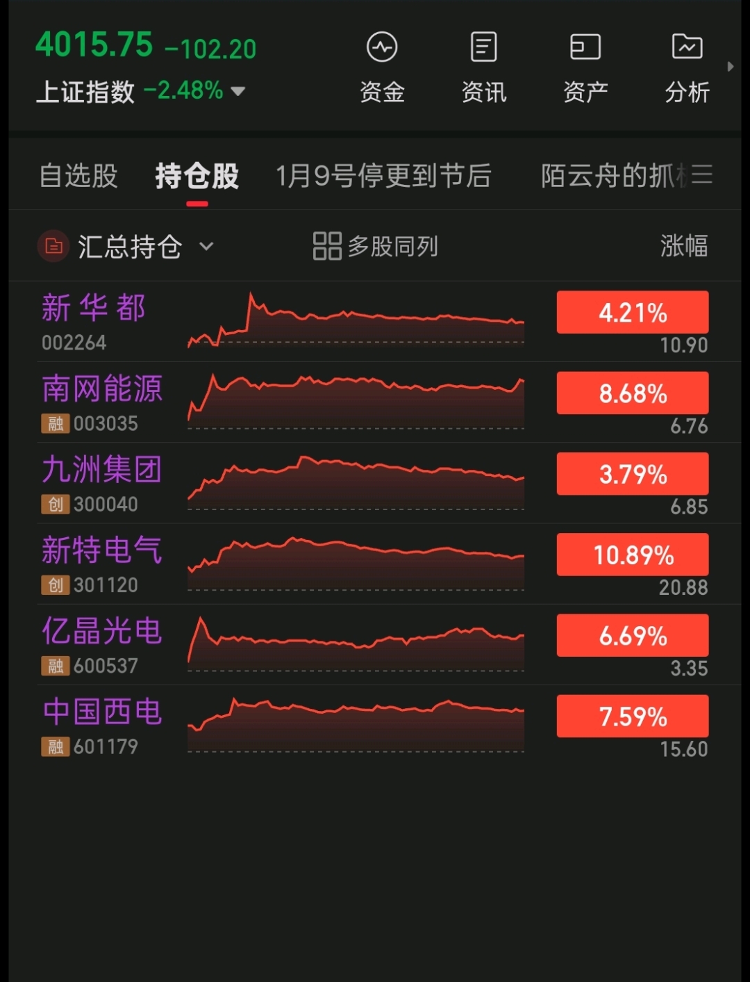 没想到今天跌了2.48%,有点吓人……希望明天能够善待我#三大指数走弱!李大霄:对A股有信心# $上证指数(SH000001)$ #SpaceX拟发100万颗卫星建太空AI算力中心# $商业航天(BK0963)$ #AI算力引爆变压器荒,订单排到2027年# $电网设备(BK0457)$ #黄金白银双双暴跌,贵金属后市何去何从?# #特斯拉机器人将量产,马斯克称最大对手在中国#