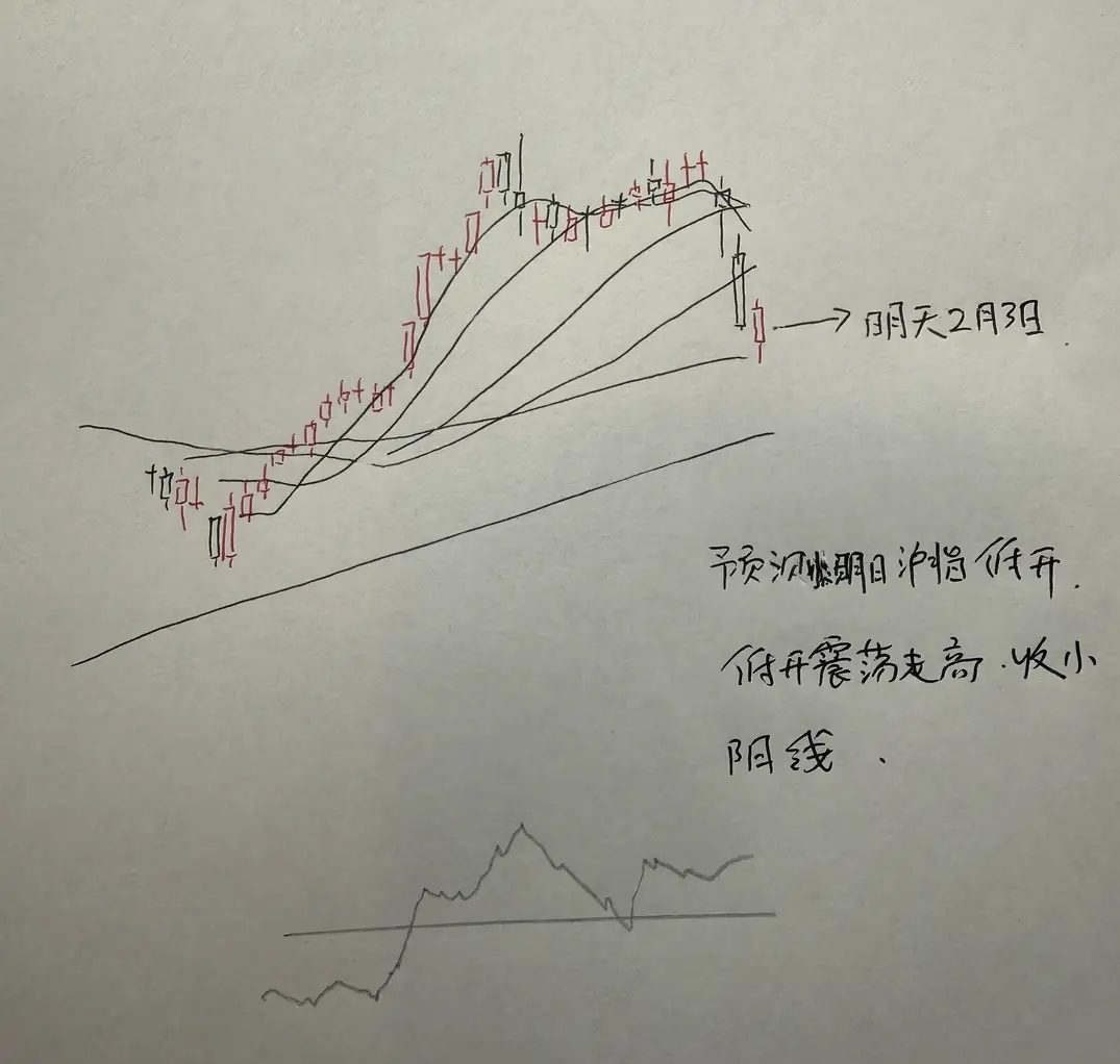所以综合以上分析,对于明天市场的走势,我认为问题并不会很大,预计明天市场指数小幅度的低开之后,就能够低开走高,走出小反弹的走势。那么明天A股到底怎么走?大家请看关于明天走势的手绘预测图:
