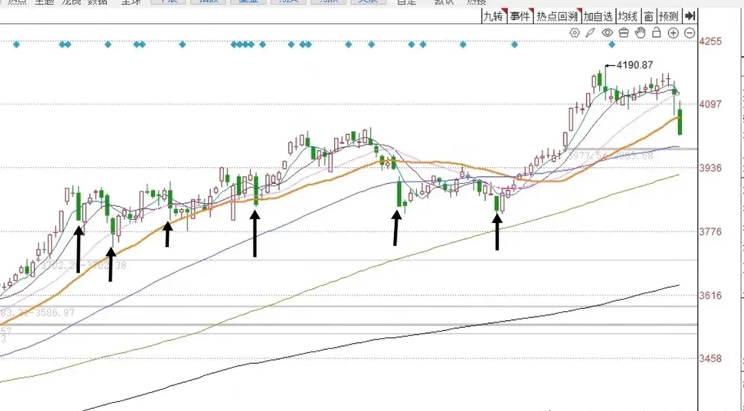 而且据我观察,A股自8月25号之后,在随后的横向盘整过程当中,每一次出实体大阴的时候,随后都会跟随反弹。大家请看下图——上证指数日线图。