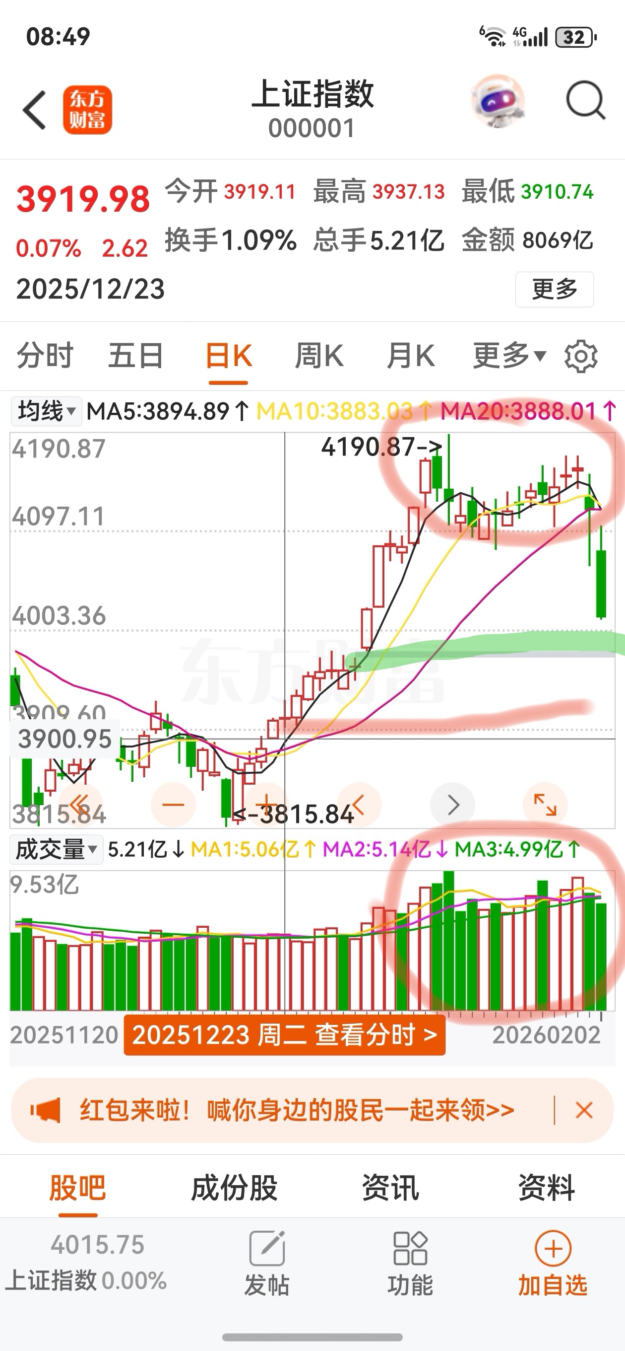 $上证指数(SH000001)$ 今天有抵抗性,但午后如果仍然撑不住,就还有年前这近两周的步步惊心,到达3920左右企稳,4100附近的量太大,套牢筹太多,年后再见吧!