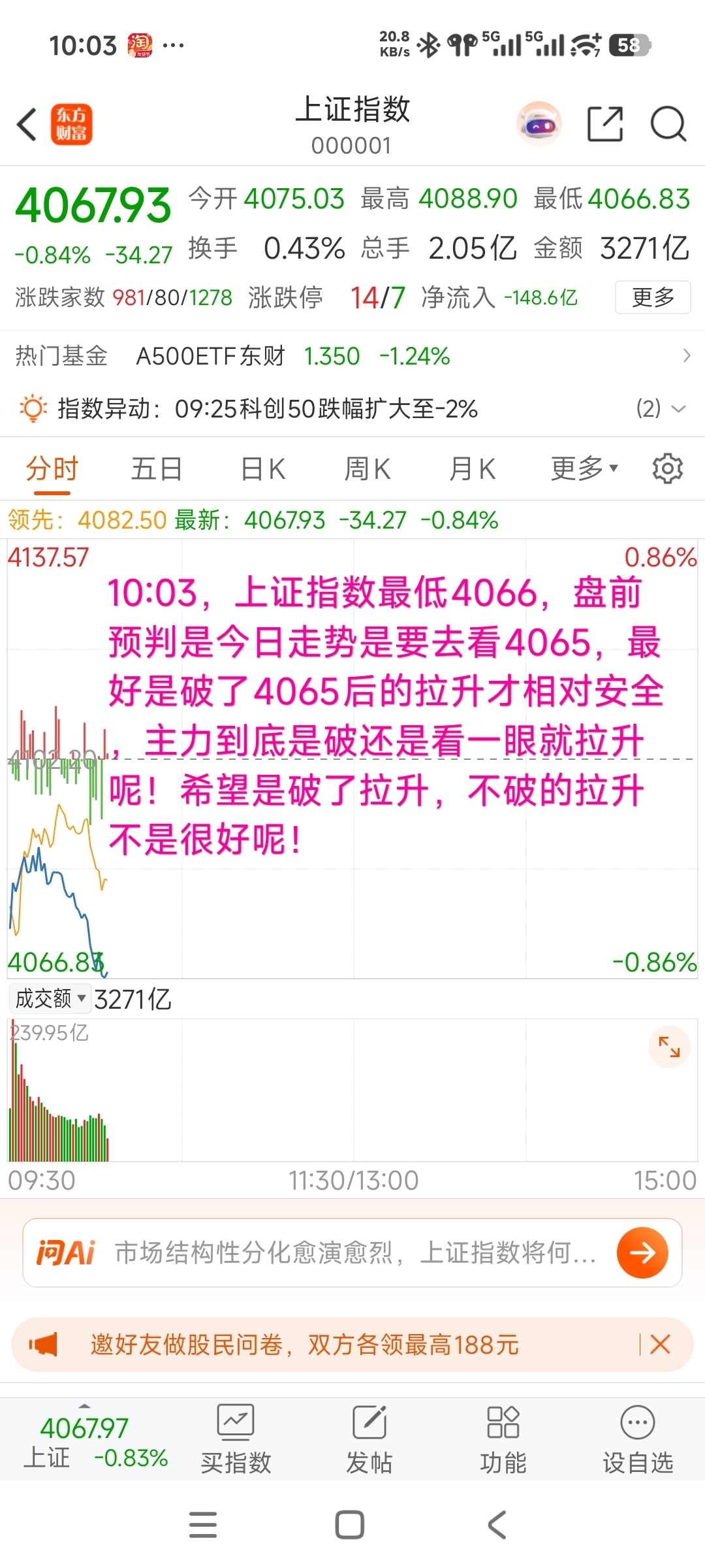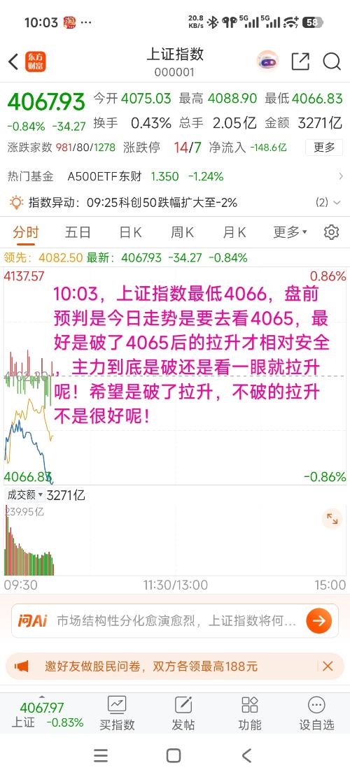 10:03,上证指数最低4066,盘前预判是今日走势是要去看4065,最好是破了4065后的拉升才相对安全,主力到底是破还是看一眼就拉升呢!希望是破了拉升,不破的拉升不是很好呢!$上证指数(SH000001)$$深证成指(SZ399001)$$东方财富(SZ300059)$